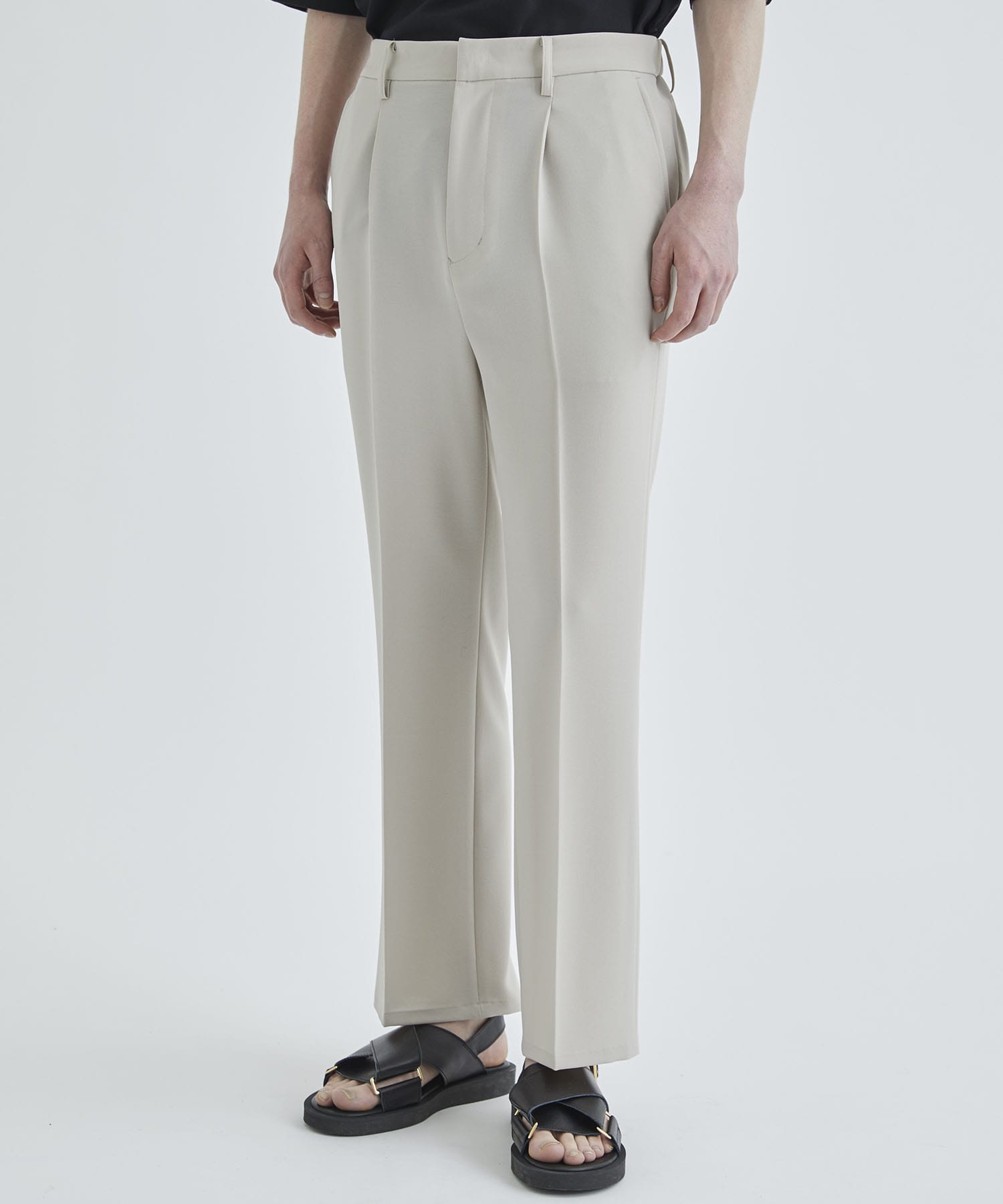 ・脚長効果のあるセンタープレスと、立体感を生み出すタックのデザインが特徴のスラックスパンツ