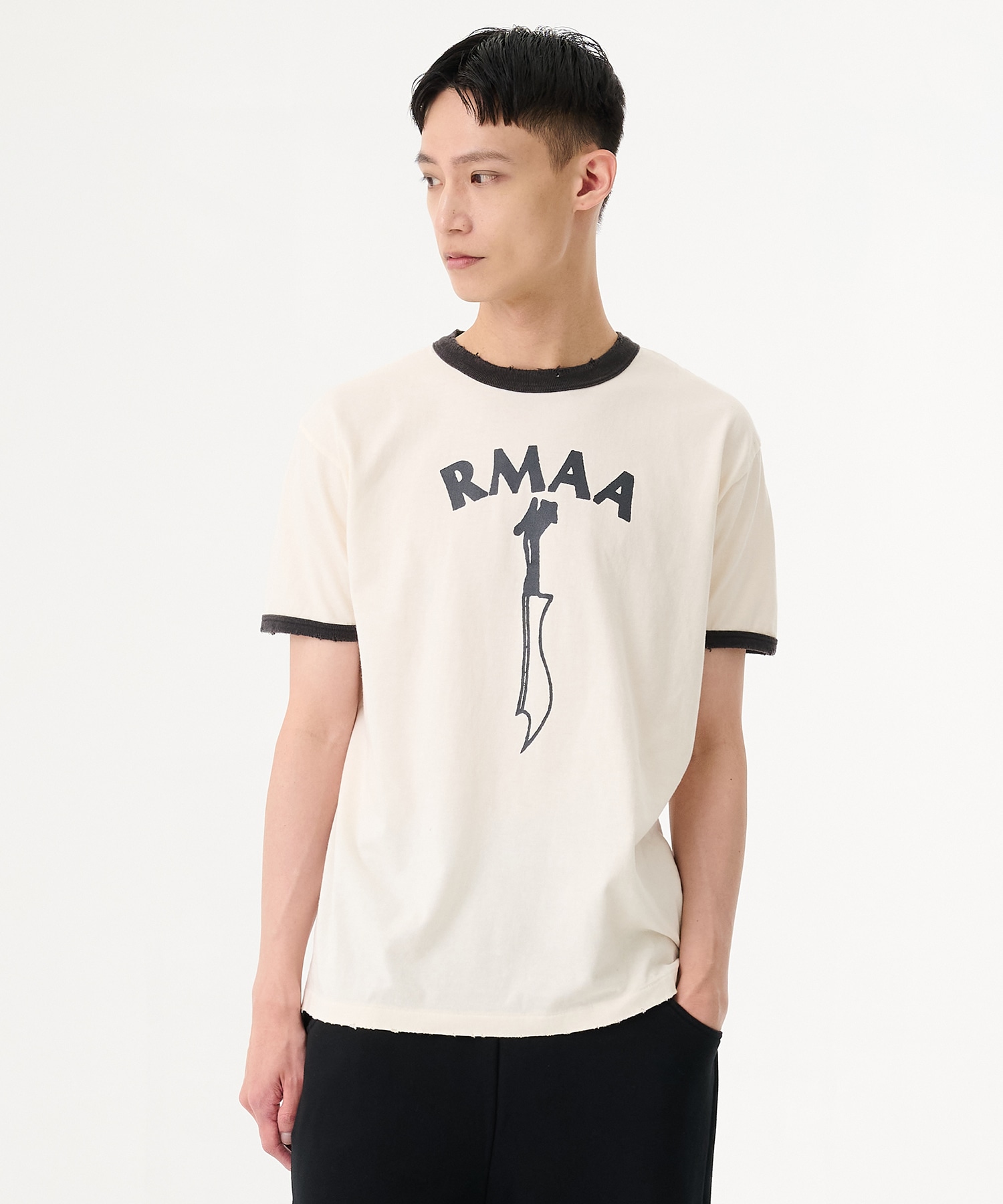 デザイン クラシックなリンガーTシャツに、印象的な「RMAA」ロゴとグラフィックを大胆に配置。 首元と袖口にはダメージ加工を施し、70年代のヴィンテージ感を漂わせた一枚。 ・裏地:なし ・伸縮性:あり