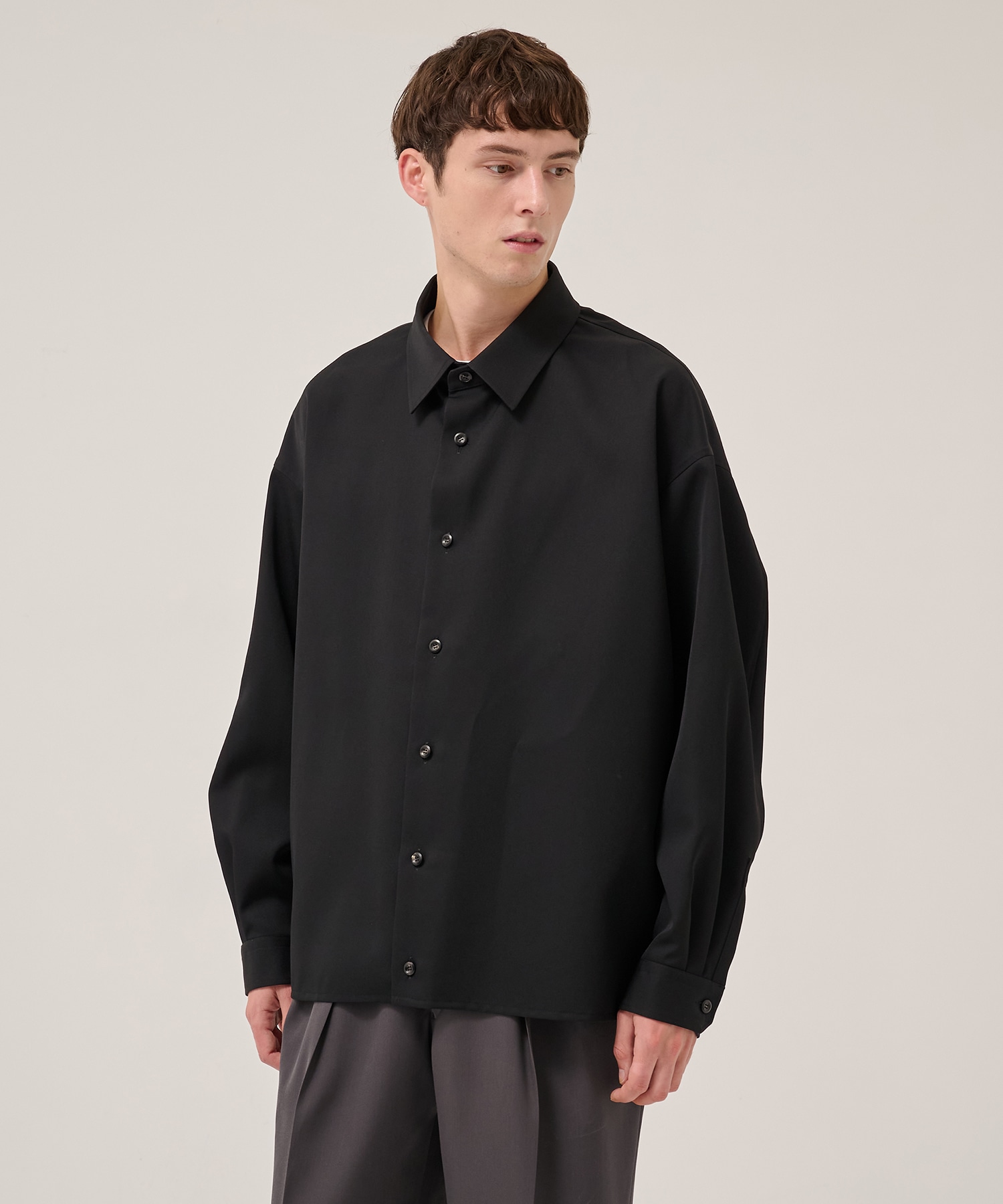デザイン メリノウールのギャバジン素材を使用したバルーンシャツ。 肘部分のタックによりボリューム感のあるアームデザインが特徴です。 身頃のシェイプがなくストレートに落ちるラインで、全体的にゆとりを持たせたパターンに仕上げ、ドロップショルダーは重力に対し自然に直下し、アームホールに無駄なシワが入ることなくバストの抱きも美しく見えるように計算されています。 また、袖を少し長めの設計にすることでカフスがブラウジングされ、袖口のタックによりボリュームをもたせています。 裾は両脇後ろ側にタックを入れることで後身頃がブラウジングされ丸みのあるラインを形成しているのに対し、フロントはストレートなボックスシルエットでボトムスが合わせやすい印象に仕上げています。 ハリと清涼感のある風合いでシャツとしてはもちろん、軽めのジャケット代わりにもお使いいただける汎用性の高い一枚です。 ・素材:WOOL 100% ・透け感:なし ・裏地:なし ・伸縮性:なし メーカー品番:25FW-REBL-456-J -THE RERACS- デザイナーの倉橋直実氏は、セレクトショップ勤務中にパターンメイキングやテキスタイルを学び、その後ブランド活動をスタート。 ベーシックでありながらも既成概念に捉われず、時代に合ったシルエットや素材を追求しながら、 着る人に依存する、着る人を美しくするデザインを提案している。 ※店舗と在庫を共有しておりますので、受注確認メールが届いてもご注文のタイミングによりましては売り切れになる可能性がございますので、予めご了承ください。 ※商品の色味につきまして、撮影環境、お客様のお使いのPCのモニター環境により実際のカラーと画像の色味が違って見える場合が御座います。