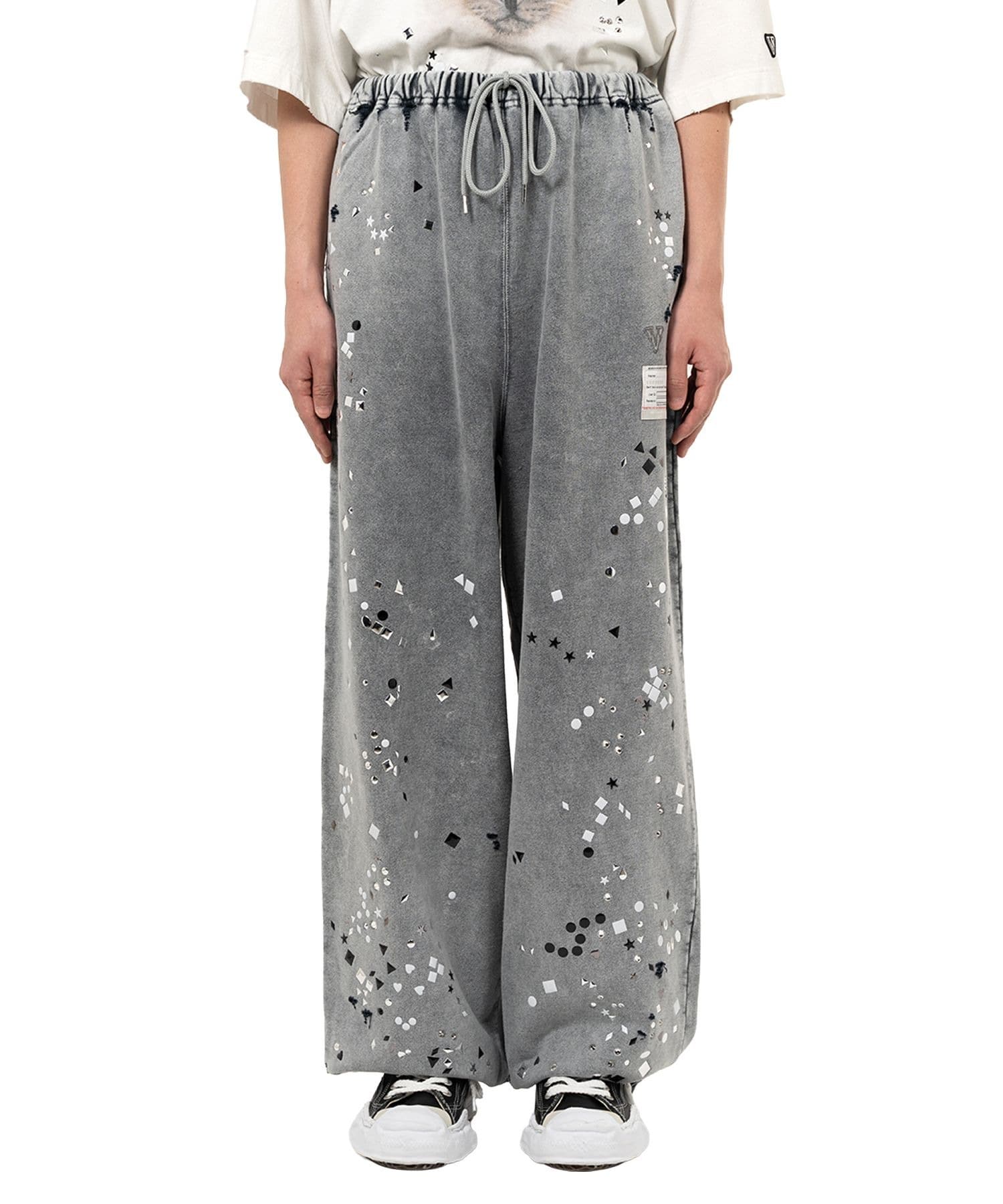 ブリーチ加工を施したスウェットパンツに装飾を加えたデザイン。