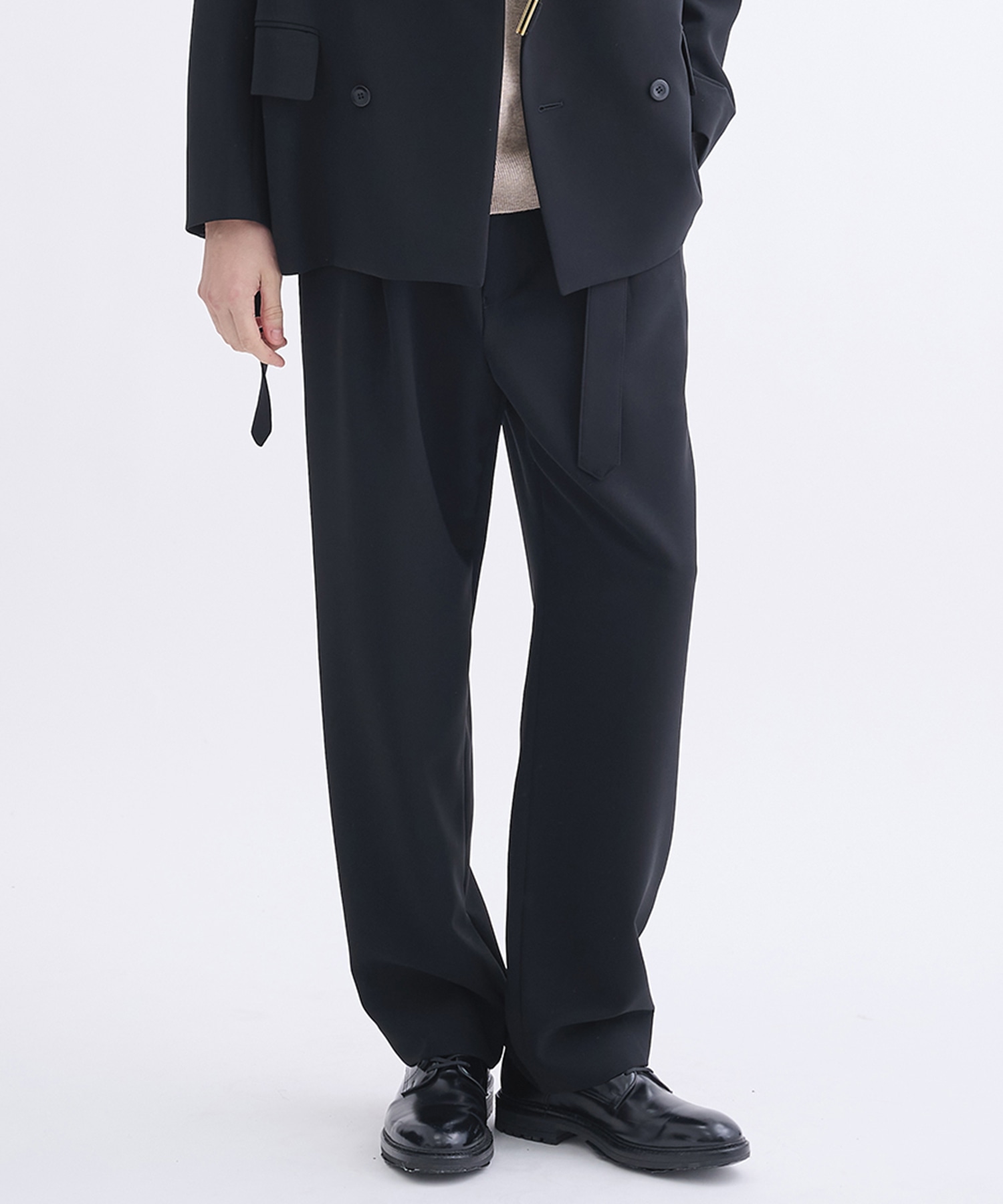程よいハリがある軽量なダブルクロスを使用したベルト付き2タックワイドパンツ。