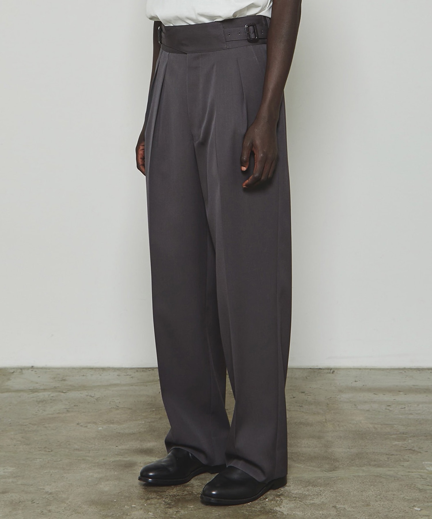 デザイン メリノウールのギャバジン素材を使用したグルカスラックス。 イギリス軍のグルカパンツをベースにTHE RERACSらしいシルエットと素材に落とし込んだデザイン。 フロントにタックを入れ、立体的な腰回りを構成しゆるやかにテーパードさせたライン。 対してウエストはフィットさせ特徴的なバックルデザインをアクセントにすることで、メリハリあるシルエットに。 素材のハリ感とパターン設計が合わさり、THE RERACSで長年愛されているスラックスです。 2/54番の厳選された梳毛糸を縮絨したカレッジフランネル素材。 国内トップクラスの限られた技術によりタテ糸を限界まで追い込み高密度に織り上げています。通常工程の3倍もの時間をかけ 縮絨・起毛を繰り返し高密度に圧縮することで毛が抜けにくく、型崩れしにくい素材となっております。繊維が長く繊細な原毛を使用する為、構成本数を増やし仕上げに対する耐久性を確保し、伝統を継承したトラディショナルなカレッジフラノ素材となっております。 バックポケットはフラップ仕様。インタックで腰回りと裾のけまわしを広めに設定したダイナミックなボリュームを形成しています。 フロントはベルトをクロスさせ、両脇のバックルでウエストをアジャストする仕様です。 バックルは高級感のある本革仕様。オリジナルのボタンは希少な水牛を用いており、一般的な物よりも立体的で厚みのある形状となっております。 オリジナルファスナーは引手が引きやすいように0.7mmの傾斜をつけて設計しています。 ・素材:WOOL 100% ・透け感:なし ・裏地:なし ・伸縮性:なし メーカー品番:25FW-REPT-263-J -THE RERACS- デザイナーの倉橋直実氏は、セレクトショップ勤務中にパターンメイキングやテキスタイルを学び、その後ブランド活動をスタート。 ベーシックでありながらも既成概念に捉われず、時代に合ったシルエットや素材を追求しながら、 着る人に依存する、着る人を美しくするデザインを提案している。 ※店舗と在庫を共有しておりますので、受注確認メールが届いてもご注文のタイミングによりましては売り切れになる可能性がございますので、予めご了承ください。 ※商品の色味につきまして、撮影環境、お客様のお使いのPCのモニター環境により実際のカラーと画像の色味が違って見える場合が御座います。 ※こちらの商品はブランド様のご意向により、ポイント付与が不可となっております。ご了承ください。