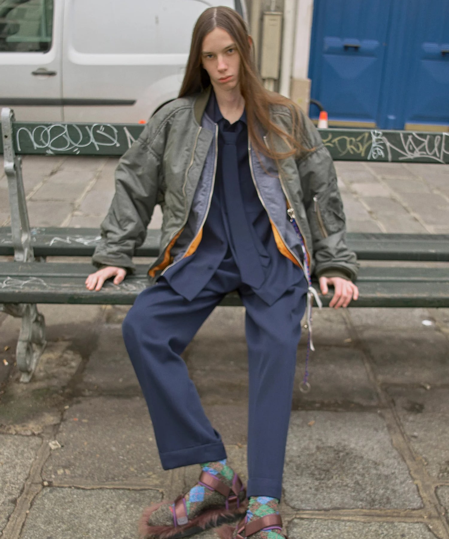MA-1を重ね着しているように見えるデザインのブルゾン。内側にドッキングされたベストのみを着用すればMA-1を背面に垂らすように着用する事も可能。ブランドらしい遊びがある今期のアイテムの中でも注目度の高い本作は、肉感のあるナイロンツイルに顔料コーティングのプリント加工をし、その後洗いにかけることでムラのある表情に仕上がった。