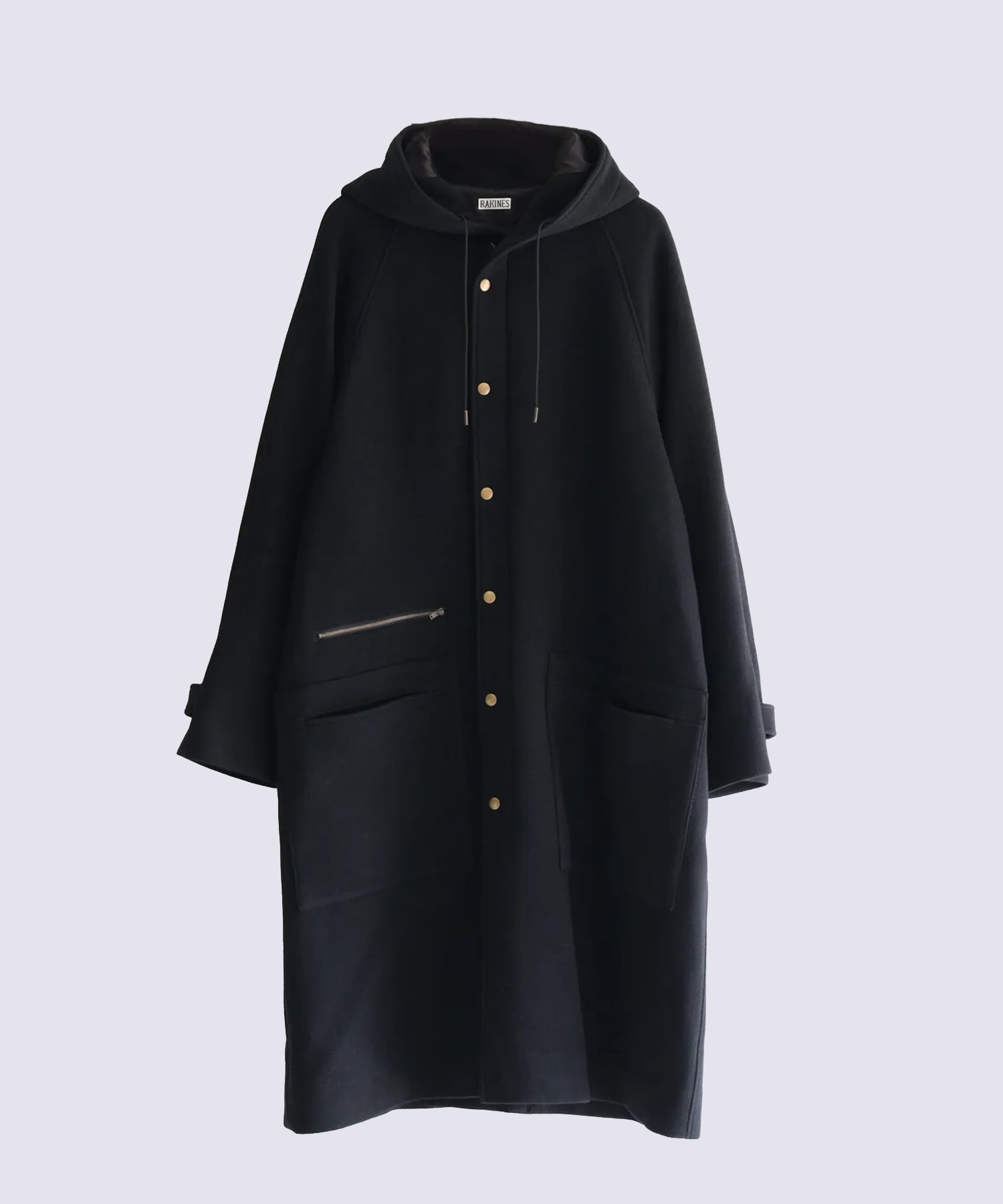 デザイン 生後5~7カ月程度の子羊から刈り取られたラムズウールを使用。 ラムズウールは繊維が細かく柔らかいため風合いが良くなります。 この原料を使用した紡毛糸を使ってざっくりとしたツイードタッチに織りあげた中肉素材です。 原料の良さによるふくらみや柔らかさが特徴で、軽く保温性にも優れています。 ベンチコートをベースにクラシックなコートの要素を足しながらバランスを整えました。 大きなフードが印象的で、スポーツとクラシックがどちらも強調し過ぎることなく共存しています。 ・素材:ウール90% (ラム40%) ナイロン10% ・裏地:なし ・伸縮性:なし