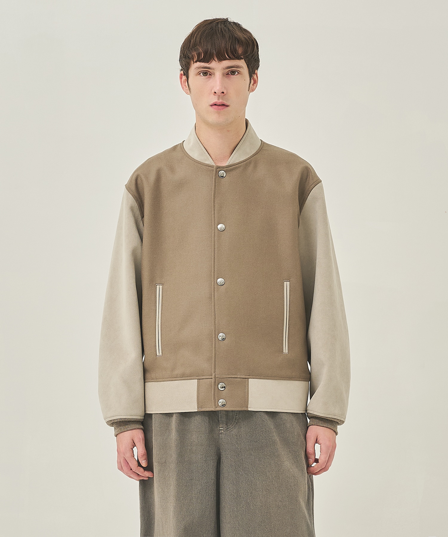 光沢感があるウールと、マットな質感のスエードが織りなす異素材のバランスや、立体的なシルエットがスタイリングにアクセントをもたらす一着です。