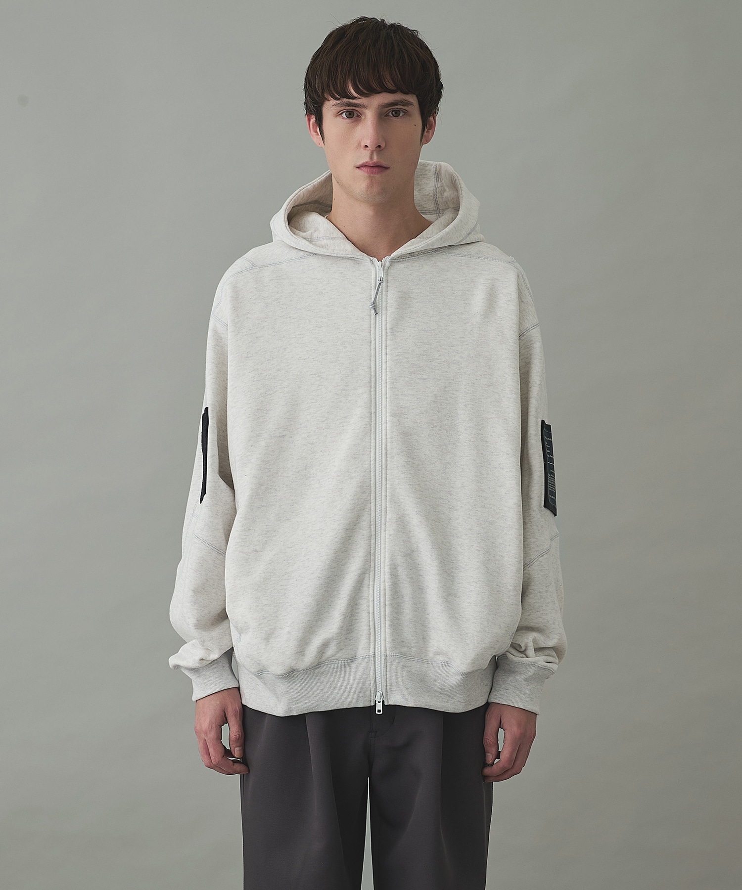 大きめのジップと程よいハリ感が特徴のジップパーカー。