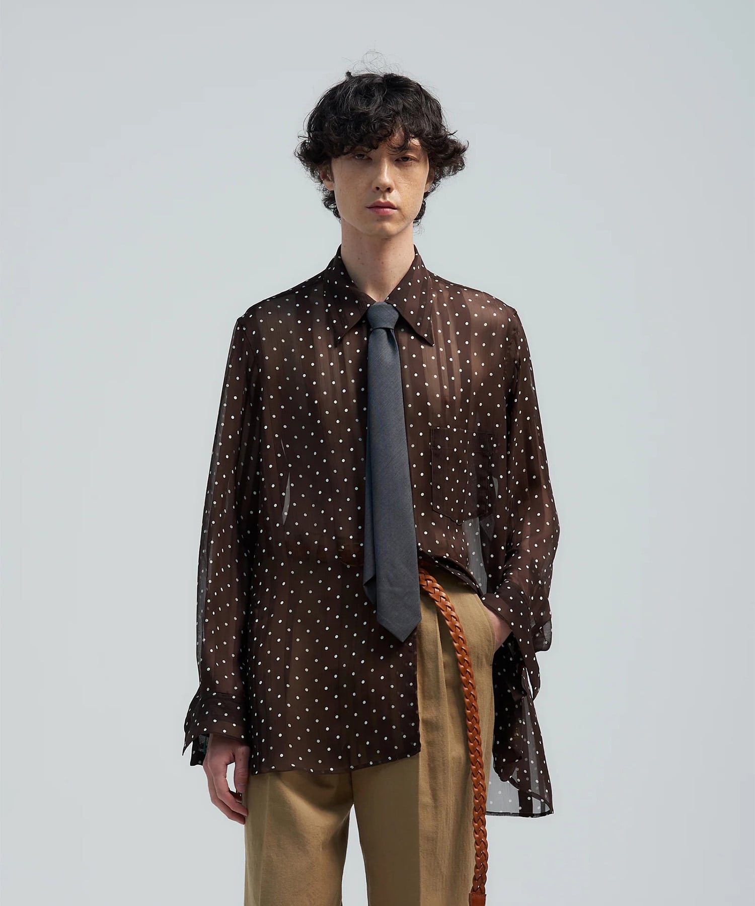 特徴的なドット柄とさりげなく佇むサテンのストライプ。絶妙なコントラストが奥行きを加え、ブランドらしい1枚に。