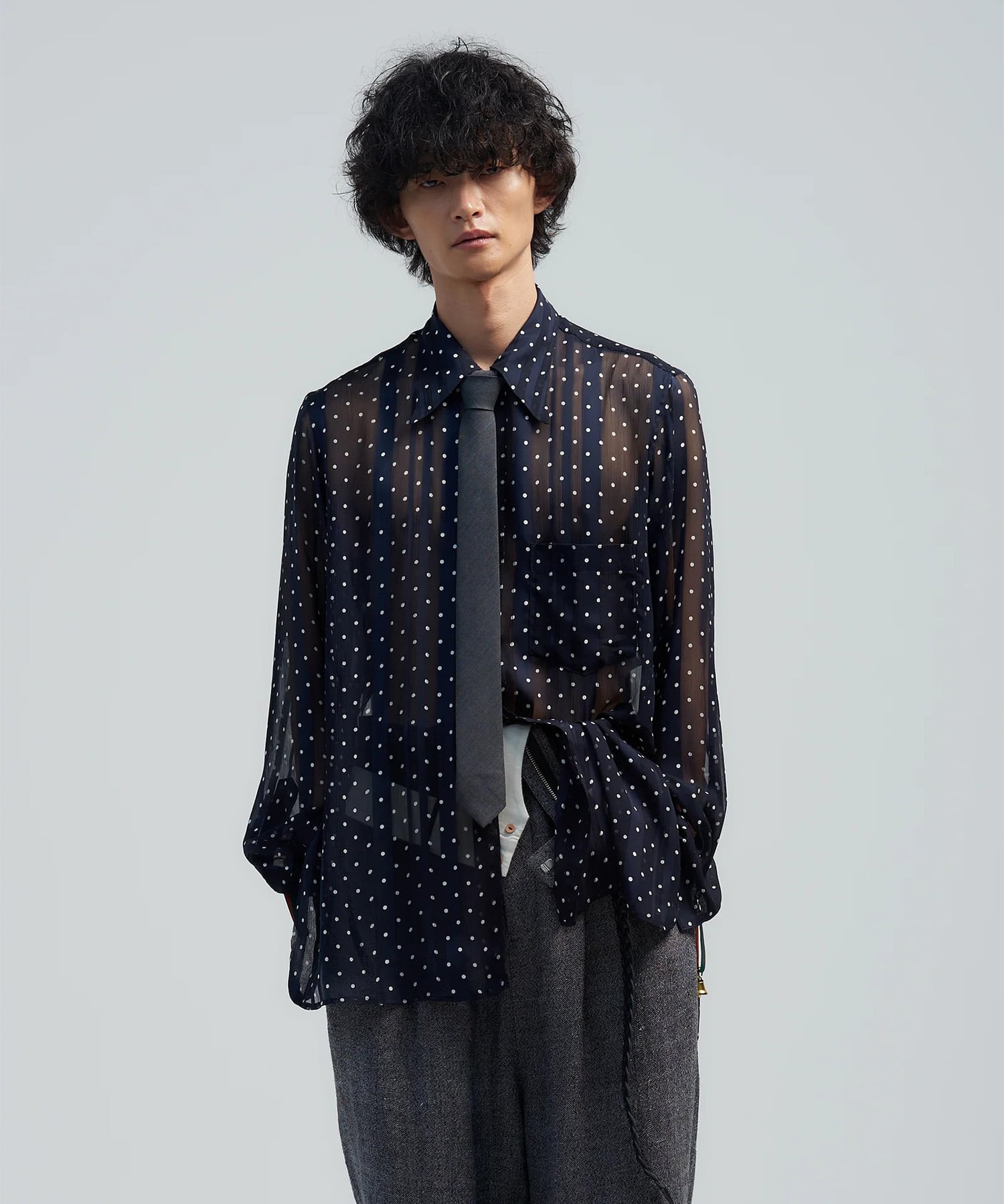 生地はシボが特徴的な楊柳組織とサテン切り替えの軽やかなものを使用し、動きのあるシャツに仕上げた。