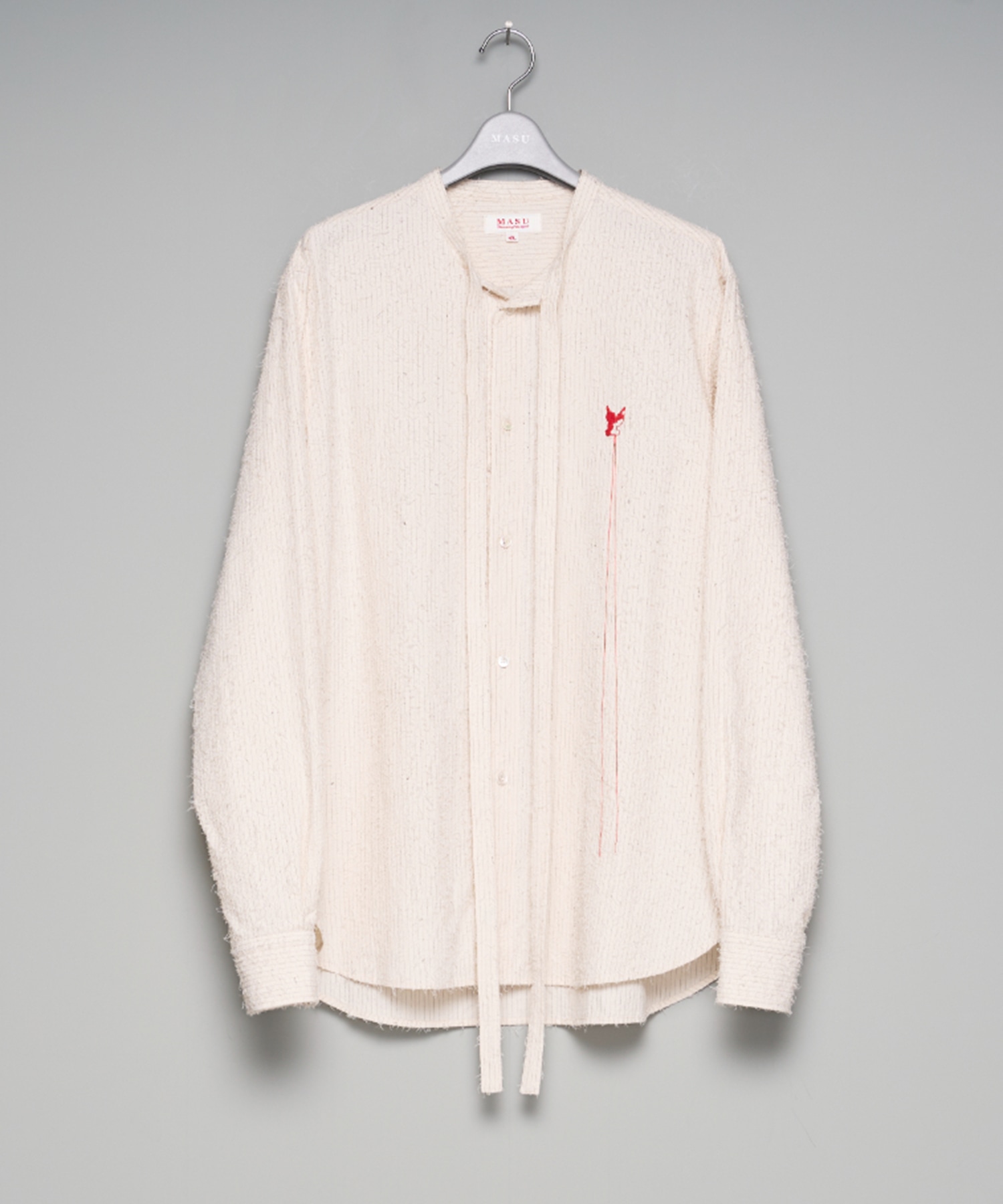 ドライなコットンのフォーマルなストライプ柄のシャツ生地に、空打ちのニードルパンチを施すことで、ストライプの輪郭が曖昧に崩れ、表面には柔らかな毛羽立ちの表情が浮かぶ。