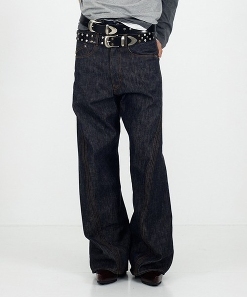 13ozナチュラルスラブローテンション織りデニムを使用したワイドシルエット立体裁断ジーンズ。