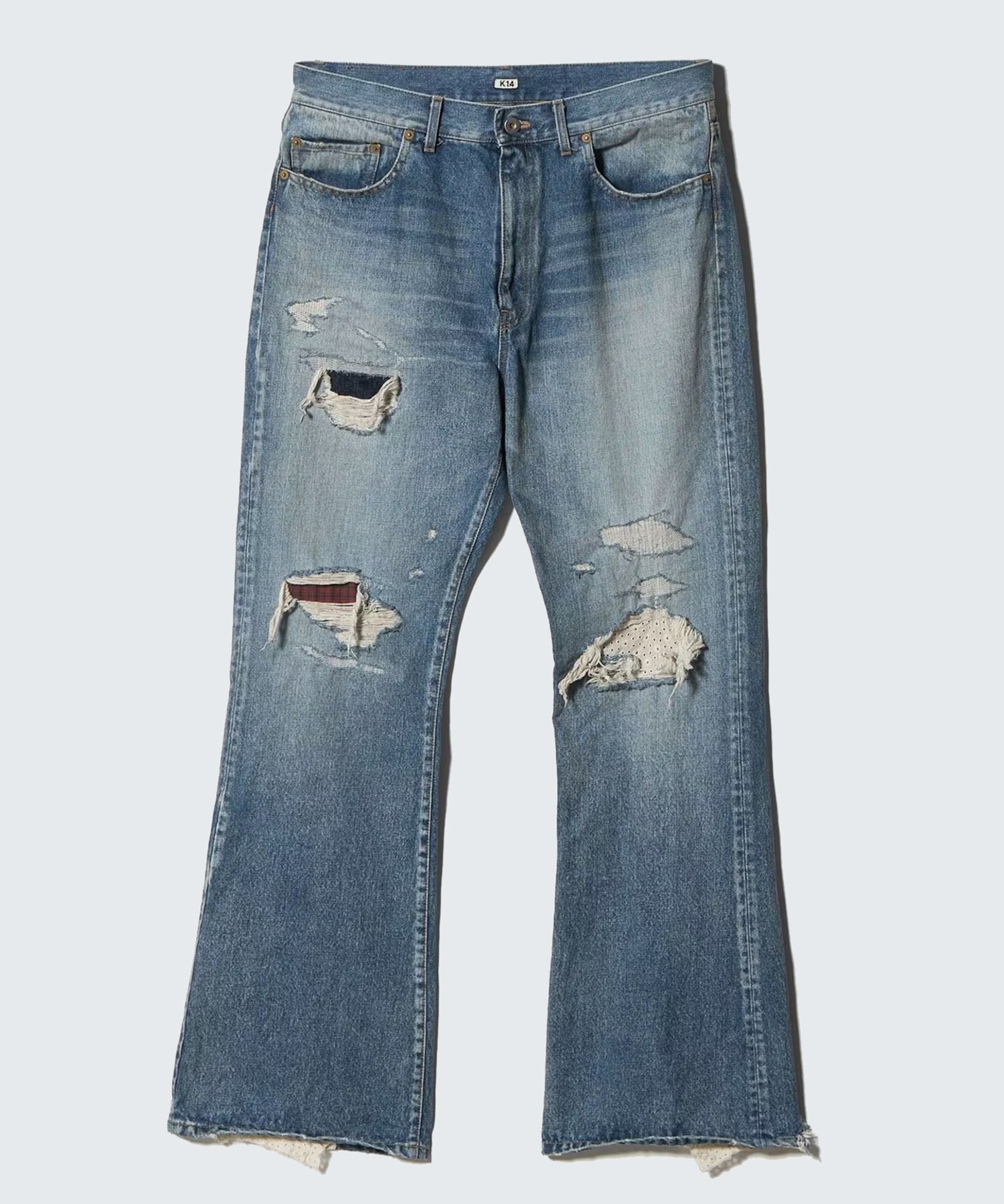 異素材を組み合わせたパッチワークが特徴的なデニムパンツ。