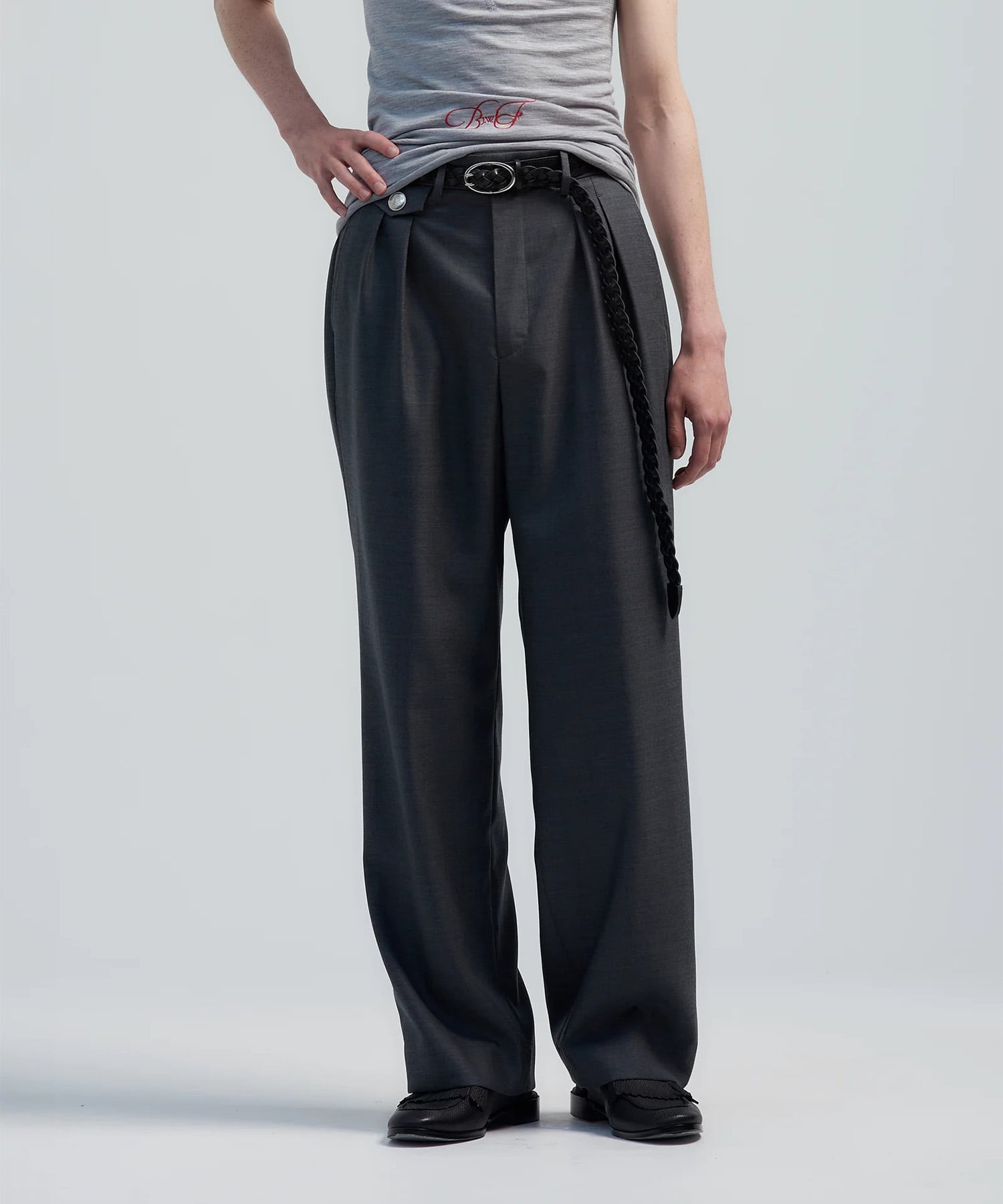 ウエストベルトを蛇腹にし、内側にゴムを取り付ける事でデザインと機能美を共存させたスラックス。