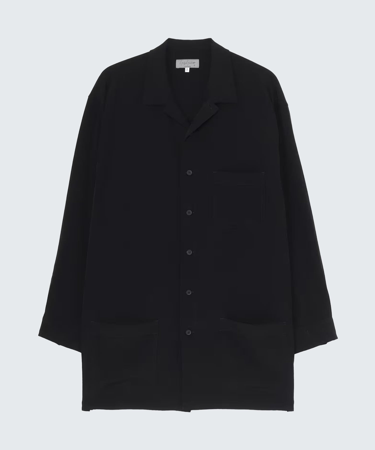トリアセテート・ポリエステルのタキシード素材を使用したアウトポケット付きブラウス。