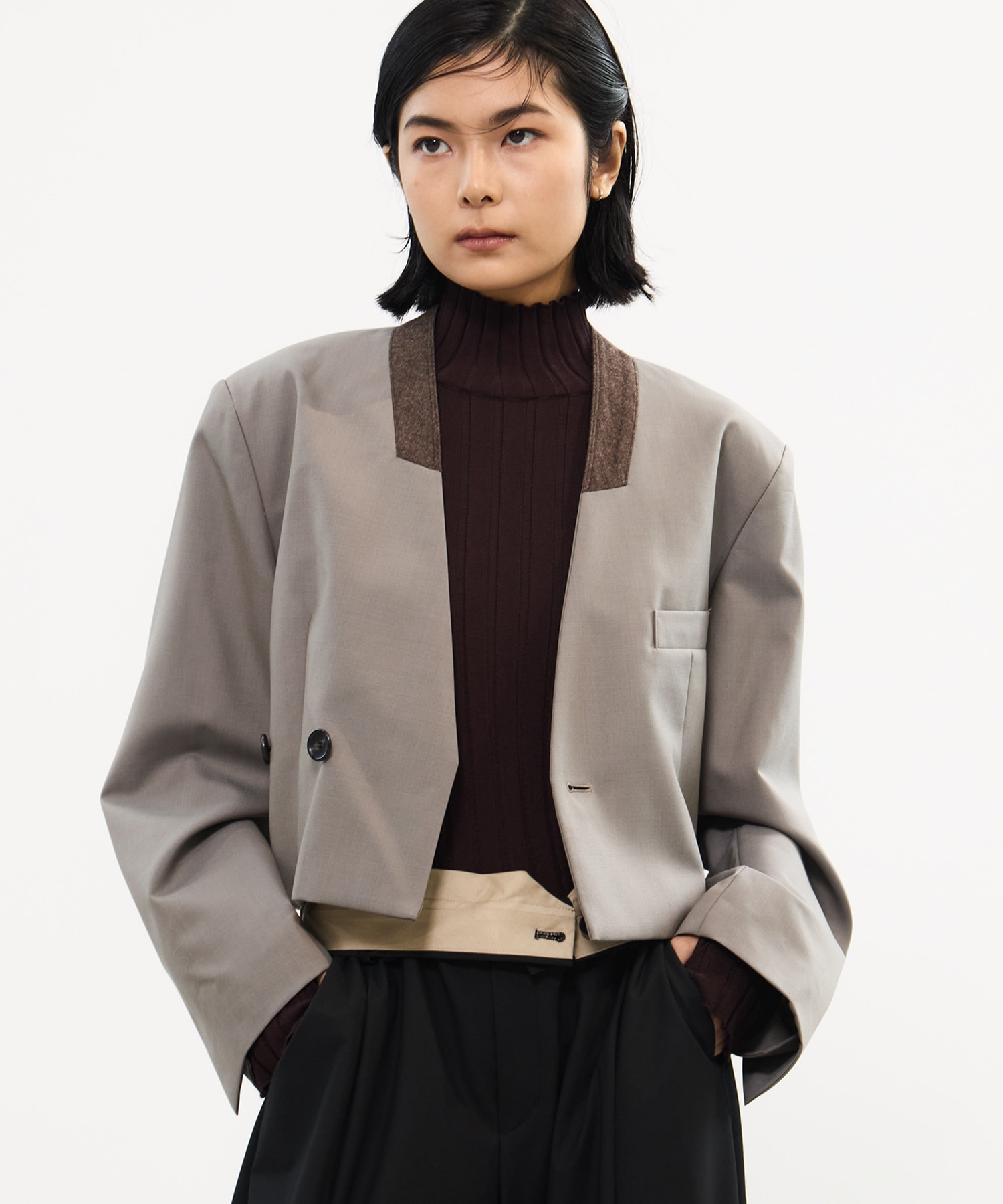 〈デザイン〉・オーバーサイズのノーカラーブレザー・無駄をそぎ落としたミニマルデザインで汎用性抜群・短めのクロップドレングスで小柄さんも高身長さんも足が長く見えるのがポイント・肩が張りすぎず女性が着やすい薄めの肩パッドを使用・テーラードジャケットの衿を切り落としたようなカラークロス衿がキャッチーで視線UP・袖裏のストライプ裏地を使用。袖をまくる自然な動作でスタイリングのアクセントに・タブ付きの内ポケットで実用性も◎〈素材〉・モヘア混の梳毛糸を使用した上質梳毛ウール素材・とても軽くてハリ感がありさらっと羽織れるのがポイント・ドライタッチと程よい薄地で季節問わず年中着用可能・袖を通しやすいキュプラ100%裏地を使用・フロントには重厚感ある本水牛ボタンを使用裏地 あり透け感 なし伸縮性 なし厚さ 普通洗濯 ドライクリーニングSTUDIOUS/ステュディオスEDGY DAY-WEAR -エッジの効いたデイウェア-溢れ出るエナジーを纏えるエッジの効いたデイウェアブランド。テーラリングを軸に、パンツスーチングやそれらを再解釈したスカート、ドレスなどを展開。パーソナルを引き立たせるミニマルなスタイルから、時代を駆け抜ける前衛的なスタイルまで自由自在に。インスタグラムアカウント(@studious_______)のアンダーバー7本には"毎日のベースとなる服"という意味を込めた。モードベーシックブランド "STUDIOUS" は 〈セレクトショップSTUDIOUS〉 で手に入る。