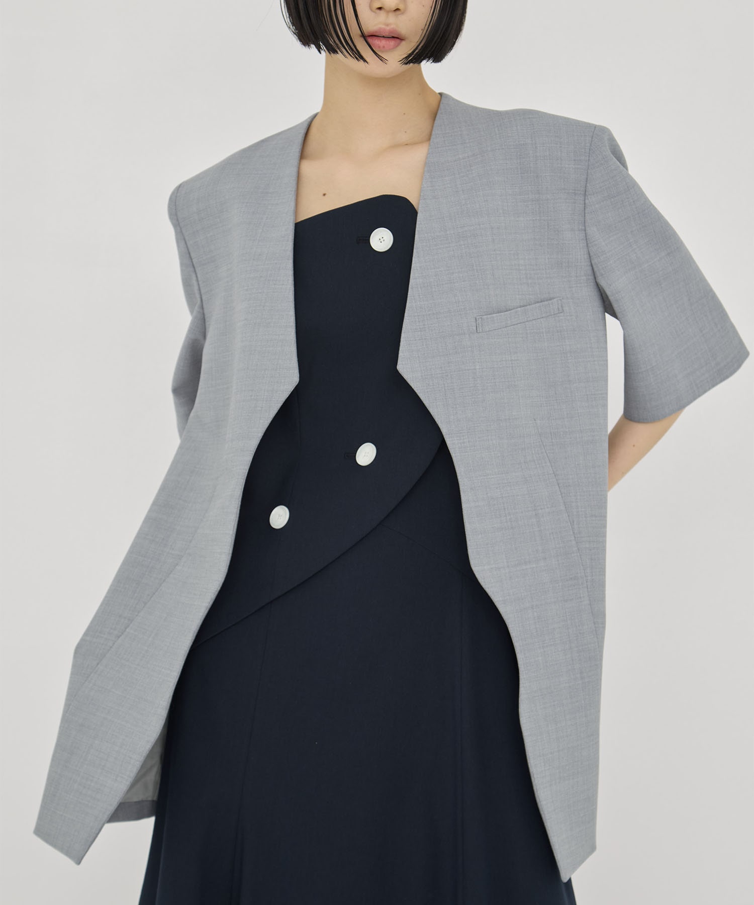・独創的な前端のカッティングが新しい個性を生むハーフスリーブジャケット