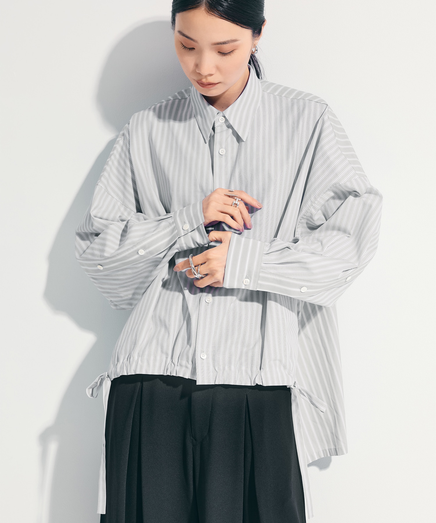 〈デザイン〉・ゆったりとしたオーバーサイズシルエットでリラックス感を演出 ・前後差のある着丈で動きのあるスタイリングが楽しめるデザイン ・裾のドローコードでシルエットアレンジが可能 ・きれいめからカジュアルまで幅広く活躍する万能シャツ〈素材〉透け感 なし裏地 なし伸縮性 なしメーカー品番:U744-B30-800UJOH西崎暢により2009年に設立された日本のファッションブランド。 パタンナーの視点によるクリエーションが特徴で、本質的なテーラーリングや大胆なカッティングなど、布の理にかなったデザインを絶妙なバランスで取り入れている。