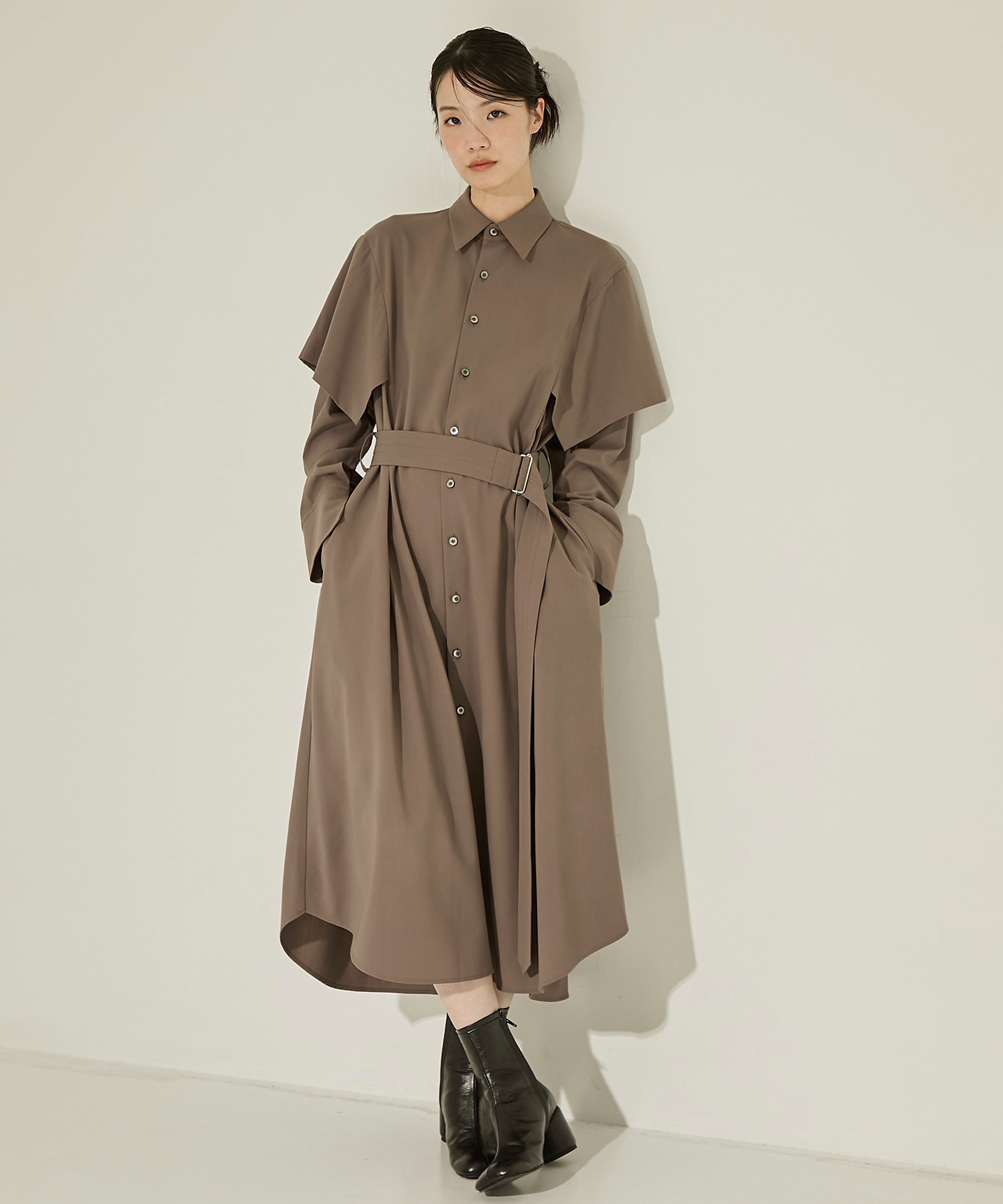 〈デザイン〉・ハンカチのような布が袖に重なったデザインが特徴のドレス・身頃の切替を利用して取ったタックの分量によるフレアなシルエットや取り外し可能なウエストマークのベルトもポイント〈素材〉・ウールとポリエステルの80/2サイロスパン糸を使用したポプリン素材・細番手使用のコンパクトでクリアな表情と柔らかくしなやかな独特な風合いが特徴・ポリウレタン糸と配することによる適度な伸縮性とウォッシャブル機能を兼ね備えた素材透け感 なし裏地 なし伸縮性 なしメーカー品番:U743-D04-900UJOH西崎暢により2009年に設立された日本のファッションブランド。パタンナーの視点によるクリエーションが特徴で、本質的なテーラーリングや大胆なカッティングなど、布の理にかなったデザインを絶妙なバランスで取り入れている。