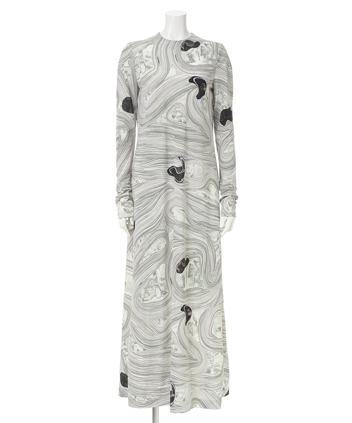 〈デザイン〉・地層石のマーブル模様をプリントしたジャージードレス・長野で出会った地層模様の石のテクスチャーや断面の景色をブランドオリジナル柄を表現・裾に向かってフレアするシルエットのドレスは、Aラインにすることでゆったりとした着用感を叶え、1枚で華やかな印象を与え忽ち装いをコンセプチュアルへと押し上げる 〈素材〉・世界でも1社のみが有する手作業のプリント技術により、繊細な柄表現が可能・軽やかなリサイクルポリエステルとリサイクルポリウレタンの生地にプリントされたマーブルは、大胆な柄ながら手作業の繊細さが際立つ美しい1着透け感 なし裏地 なし伸縮性 ありメーカー品番:MM25FW-JS075Mame Kurogouchi2010年に黒河内真衣子が「mame(マメ)」をスタート。2020年秋冬シーズンから「マメ クロゴウチ(Mame Kurogouchi)」に変更。デザイナー自身の経験や記憶に、伝統と自然、職人技術と最新のテクノロジーを複雑に織り交ぜて作り上げられるコレクションを展開する。私小説的とも言えるマメクロゴウチのクリエーションはタイムレスなデザインを上質な素材、オリジナルの生地や柄、美しい曲線を描くユニークなシルエットで都会的かつ現代的に表現し、現代における女性らしさと、女性であることへの賞賛を力強く体現する。