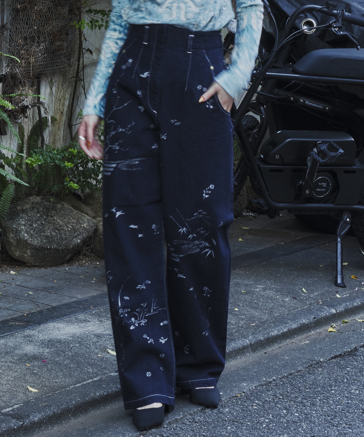 ・ハイウエストのデニムトラウザーズは、裾に向かってU字のようにカーブしたシルエットと腰から裾までアシンメトリーの花鳥柄を配すことでカジュアルなファブリックに静かな華やぎをプラスする