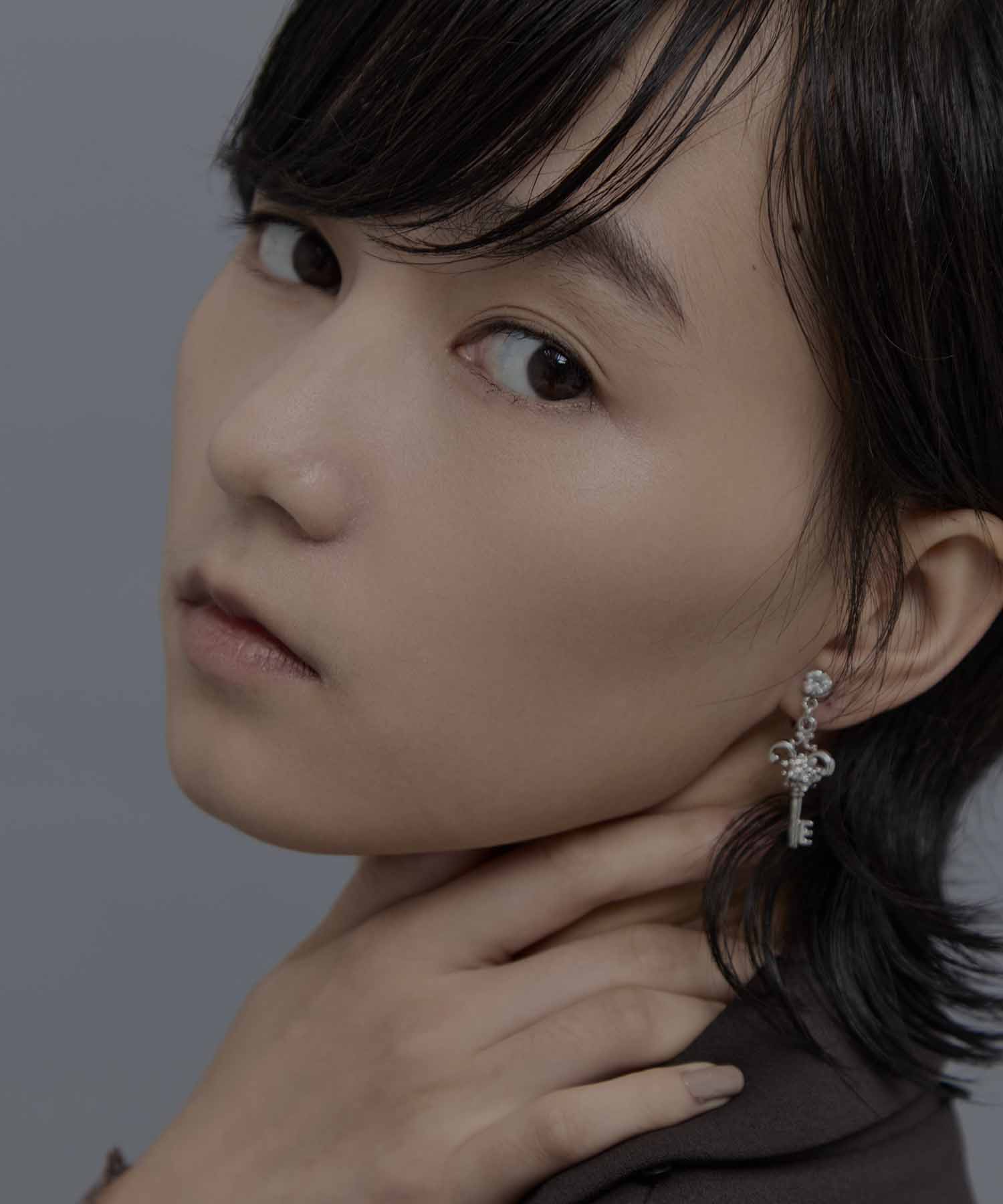 〈デザイン〉・鍵と錠がセットになったイヤリングメーカー品番:TD-25AW-AC11tanakadaisukeデザイナーの田中大資が手がけるファッションブランド。「おまじないをかけたようなお洋服で、自分の中にいるまだ見ぬ自分と出会えますように。」をコンセプトに、田中の得意とする刺繍をベースにロマンチックで幻想的なコレクションを展開。デザイナーの田中は、大阪文化服装学院卒業後に入社したケイタマルヤマを経て独立。その後、衣装制作や刺繍作家としても活動中。