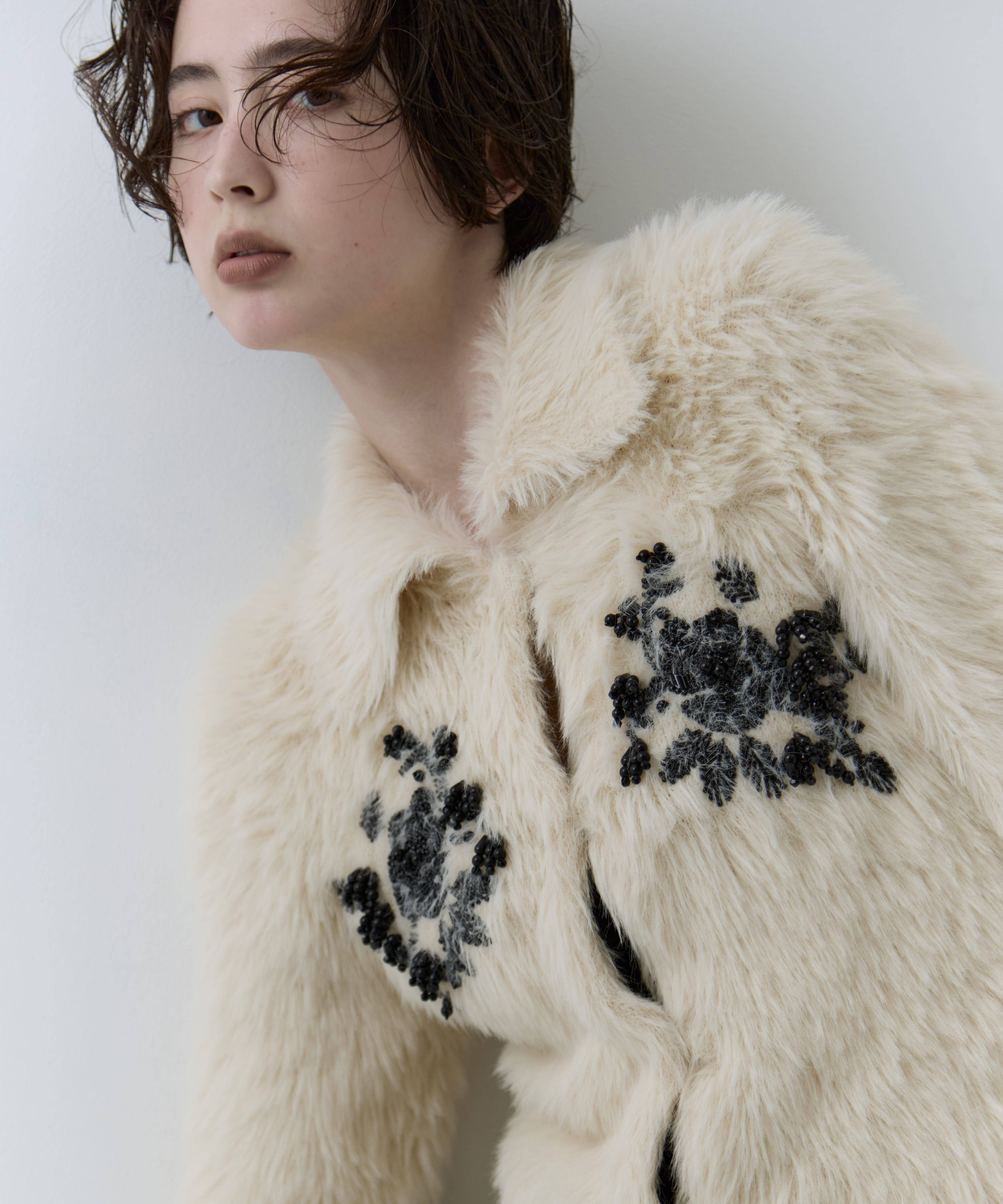 ・胸元にあしらったビジュー刺繍が、アイコニックなポイントとして煌めく