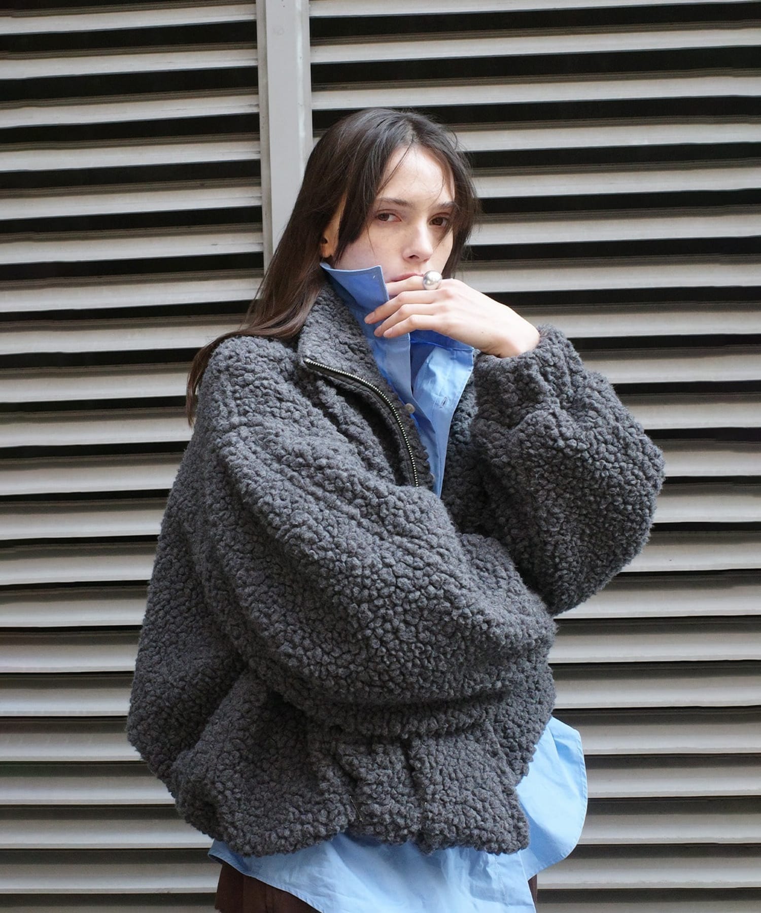 ・柔らかく弾力のあるボア素材は、見た目にも暖かく、防寒性も抜群。軽やかな着心地で、真冬のアウターとしても活躍