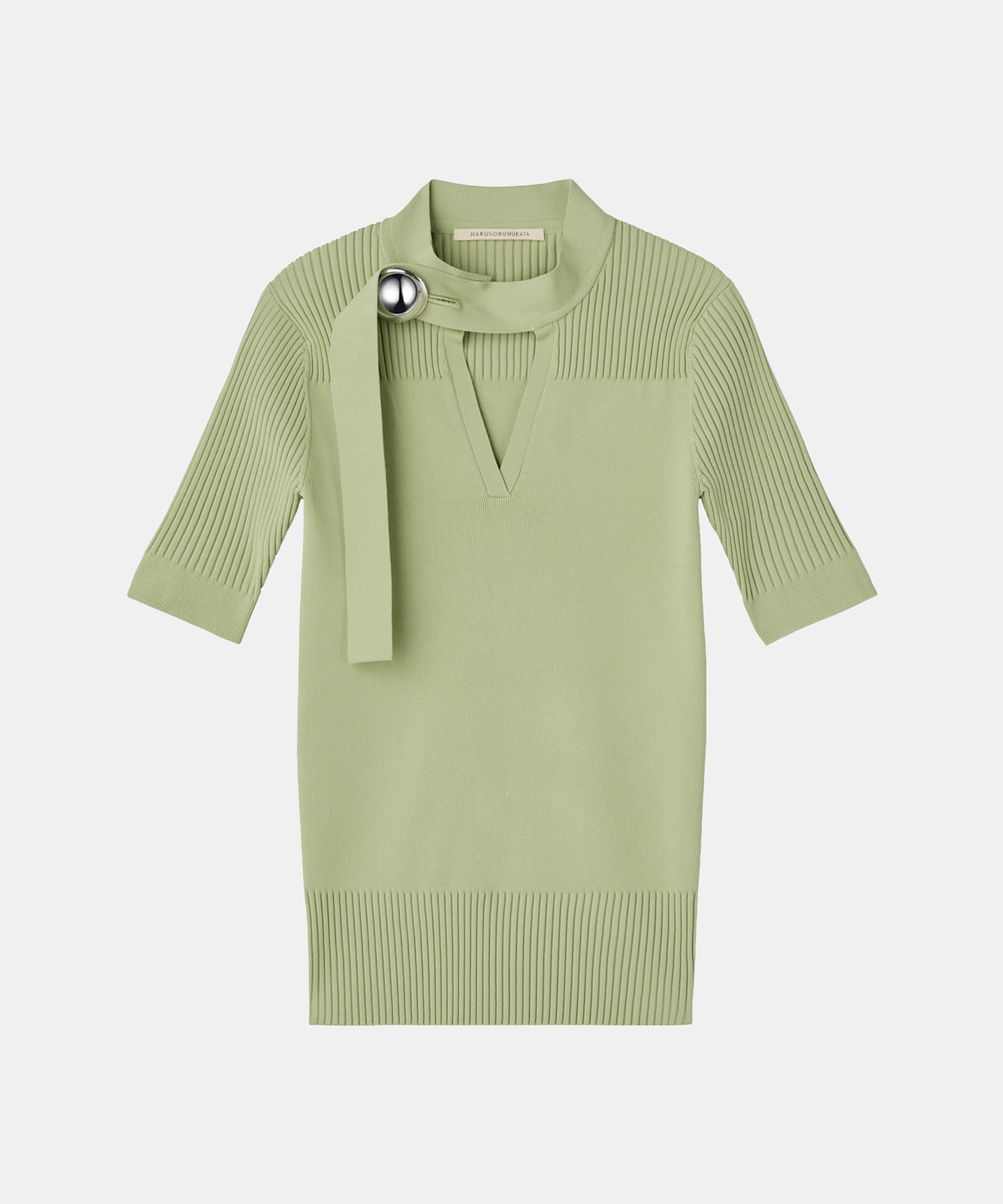 〈デザイン〉・HARUNOBUMURATAの2026年春夏コレクションより、天竺とリブのコンビネーションで仕立てたニットトップ・肩から腕まわりにかけてのラインは、自然に身体を包み込みながら、構築的なフォルムを描写・女性らしい輪郭を引き立てつつ、安心感のある着心地を実現・首元には、ブランドを象徴するアイコニックなボタンを配置。控えめながらも印象的なアクセントとなり、静かな緊張感を添えたアイテム・一枚でも、ジャケットやシャツのインナーとしても活躍でき日常の装いに静かな華やぎをもたらす、タイムレスなニットトップ〈素材〉・レーヨン83%、ポリエステル17%の混紡素材のほどよい肉感と伸縮性が、身体に寄り添いながらも美しいシルエットを保つ・また天竺とリブを組み合わせた編地が、柔らかな陰影と立体感を生み、ミニマルな中に奥行きのある表情を添えたアイテム透け感 なし裏地 なし伸縮性 ありメーカー品番:HM26S1031HARUNOBUMURATA(ハルノブムラタ)デザイナー 村田晴信が手がける日本発ラグジュアリーブランド。イタリアと日本で培った感性を背景に、仕草や佇まいの美しさに着目したコレクションを展開する。「Luxury of Silence」 をコンセプトに、クリーンなカットと上質な素材、ニュートラルな色使いによる静かな存在感が特徴。※店舗と在庫を共有しておりますので、受注確認メールが届いてもご注文のタイミングによりましては売り切れになる可能性がございますので、予めご了承ください。※商品の色味につきまして、撮影環境、お客様のお使いのPCのモニター環境により実際のカラーと画像の色味が違って見える場合が御座います。予めご了承の上、ご注文下さい。