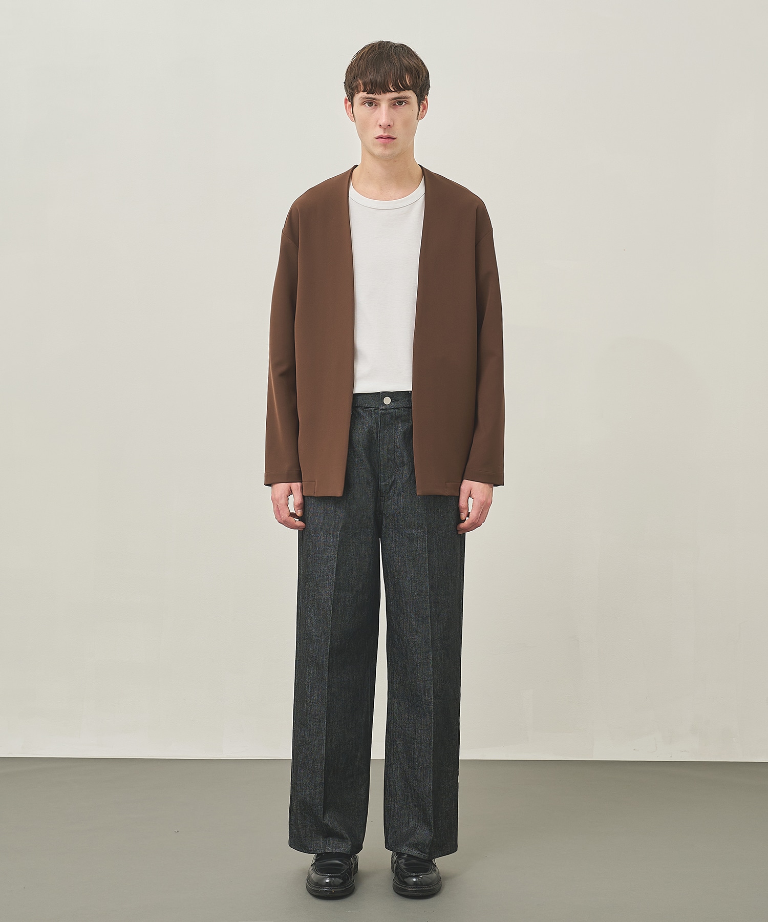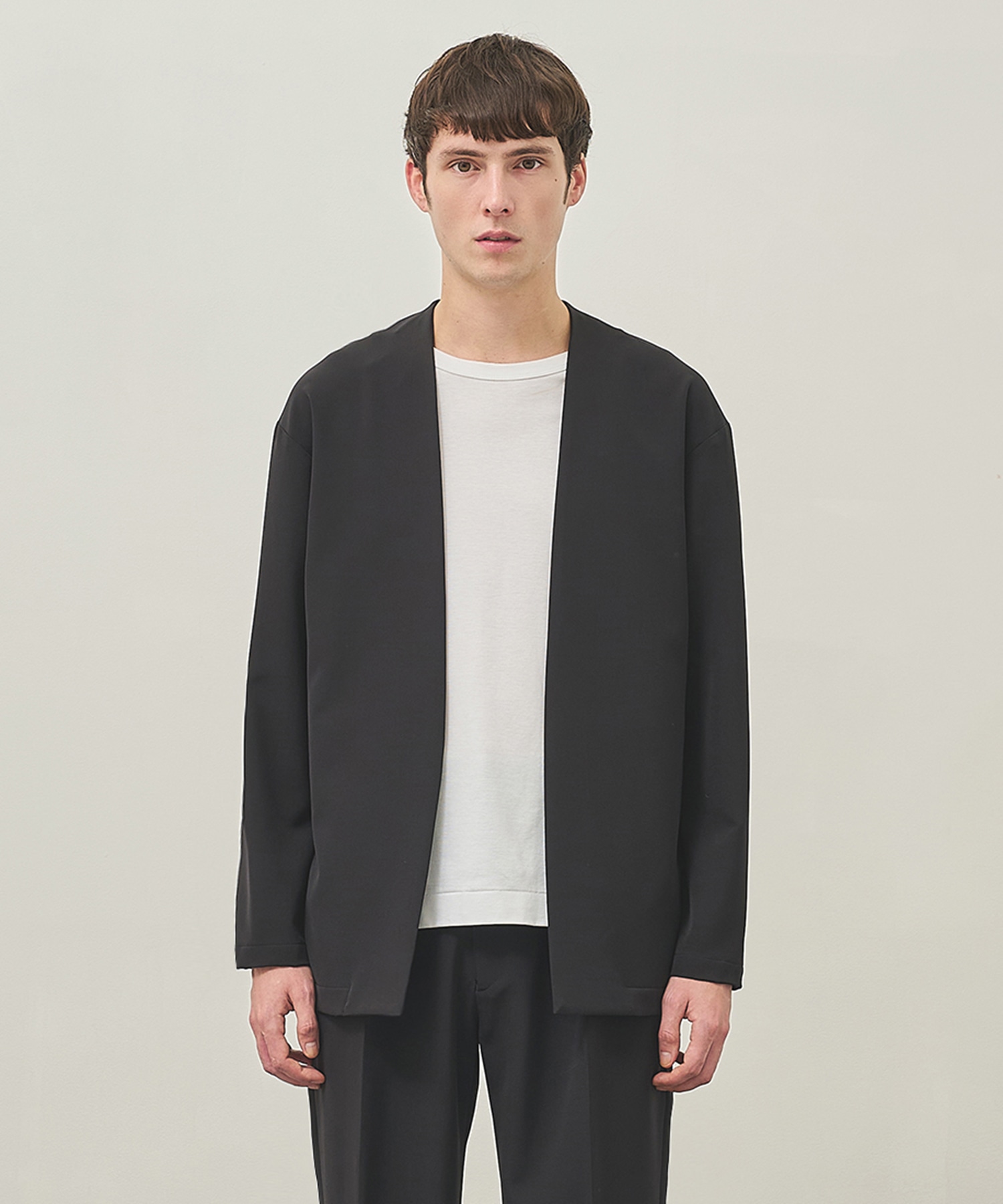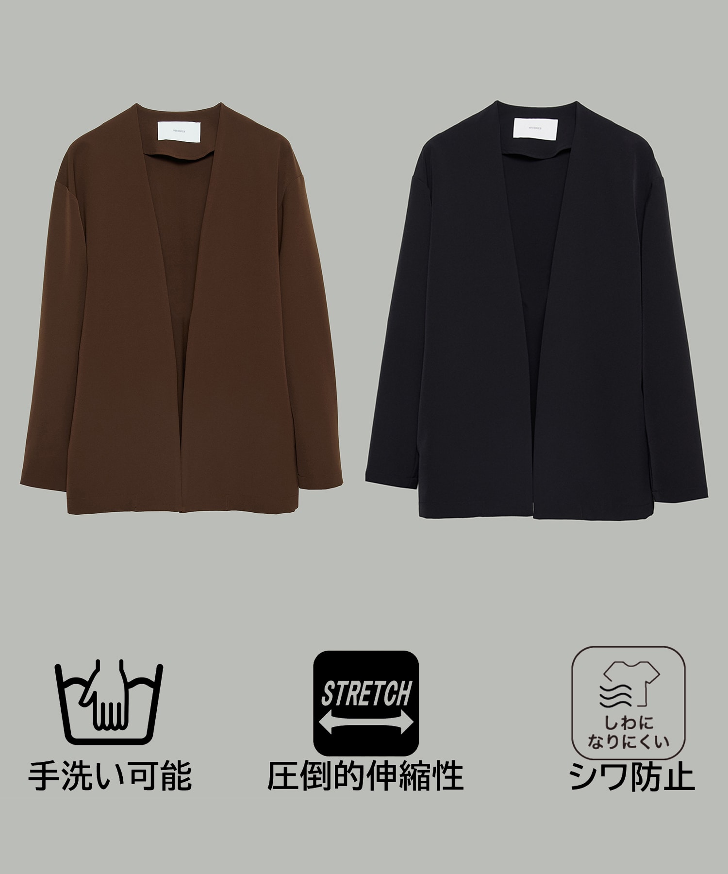 カーディガンのように羽織ることができる、オールシーズン対応のジャケット。しわになりづらく、伸縮性抜群で、ストレスフリーな着心地。