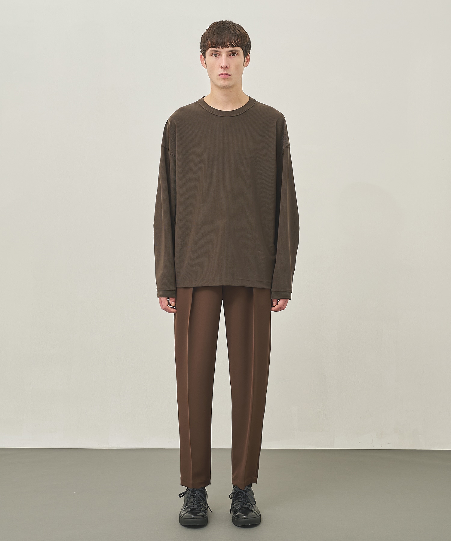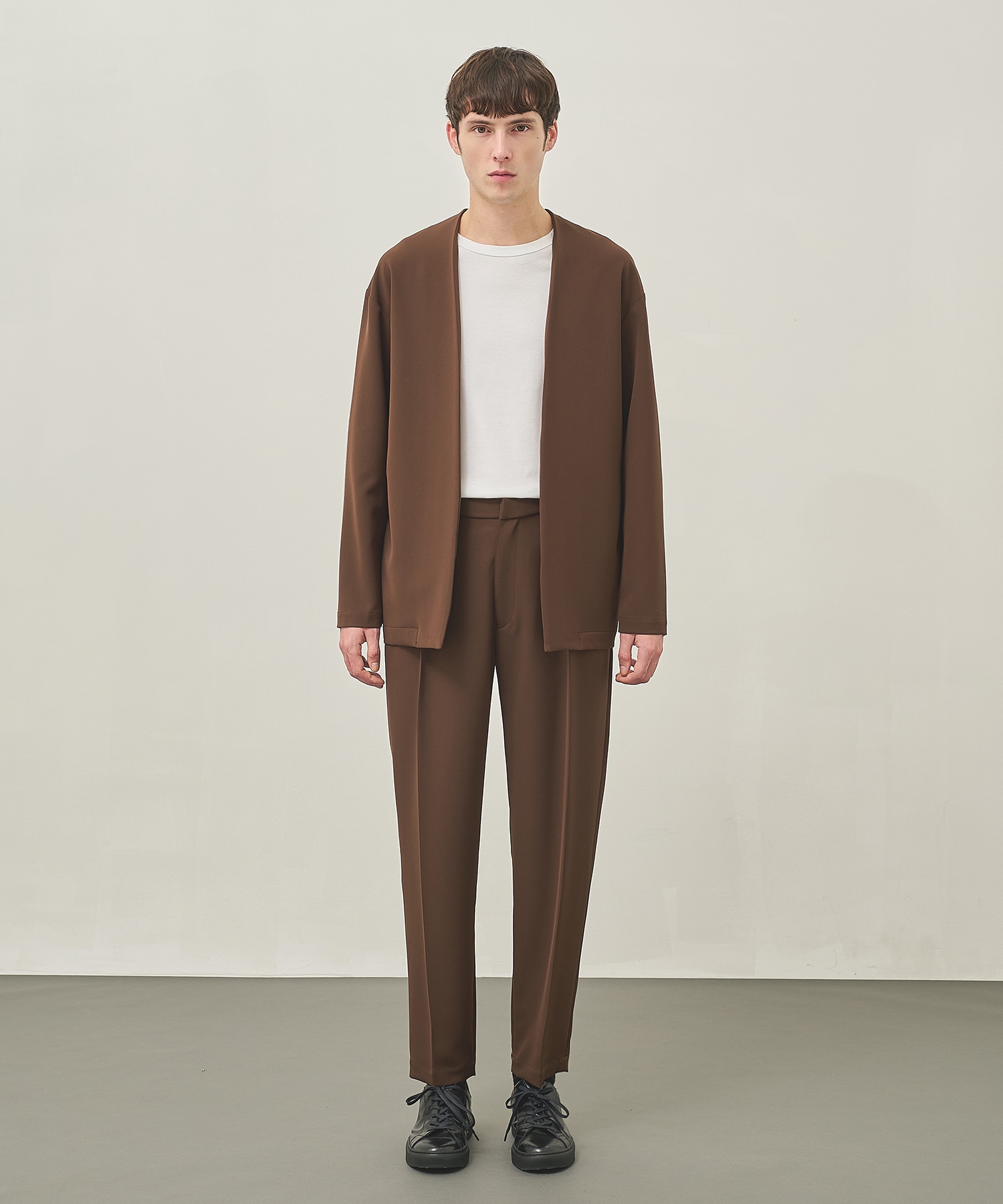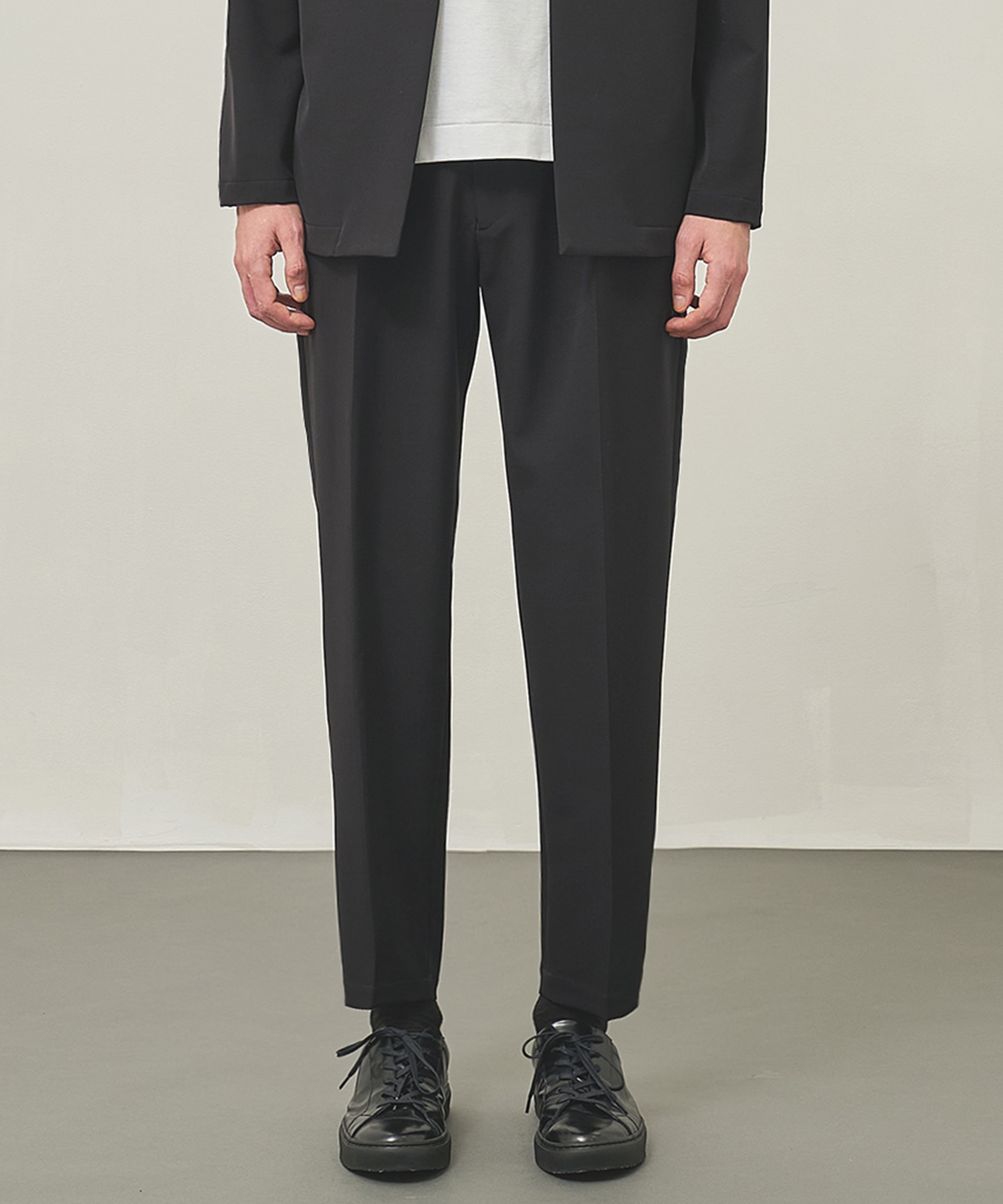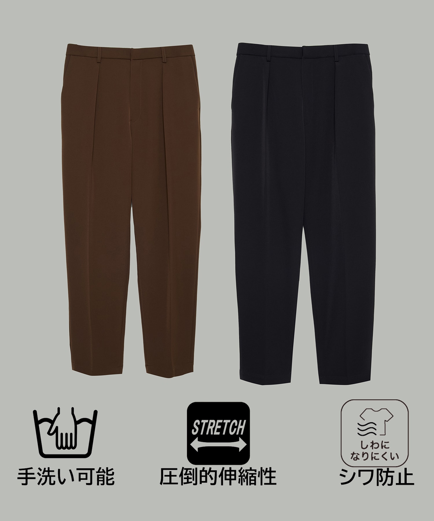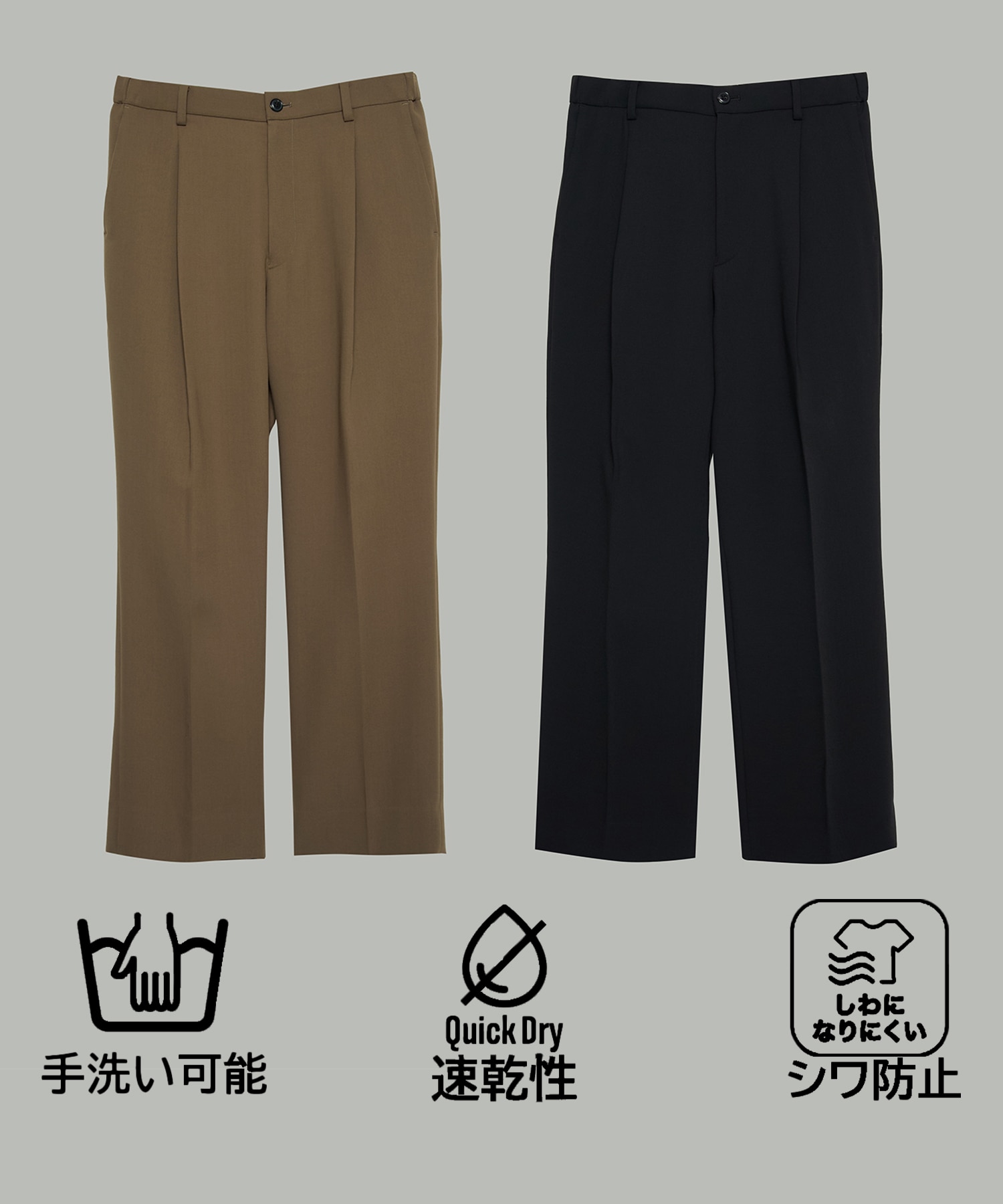 ジャケットと同素材で、ウールライクな見え感。センタープレスは洗濯しても取れづらい加工を施し、洗ってもすたれない綺麗さと強度のあるイージースラックス。