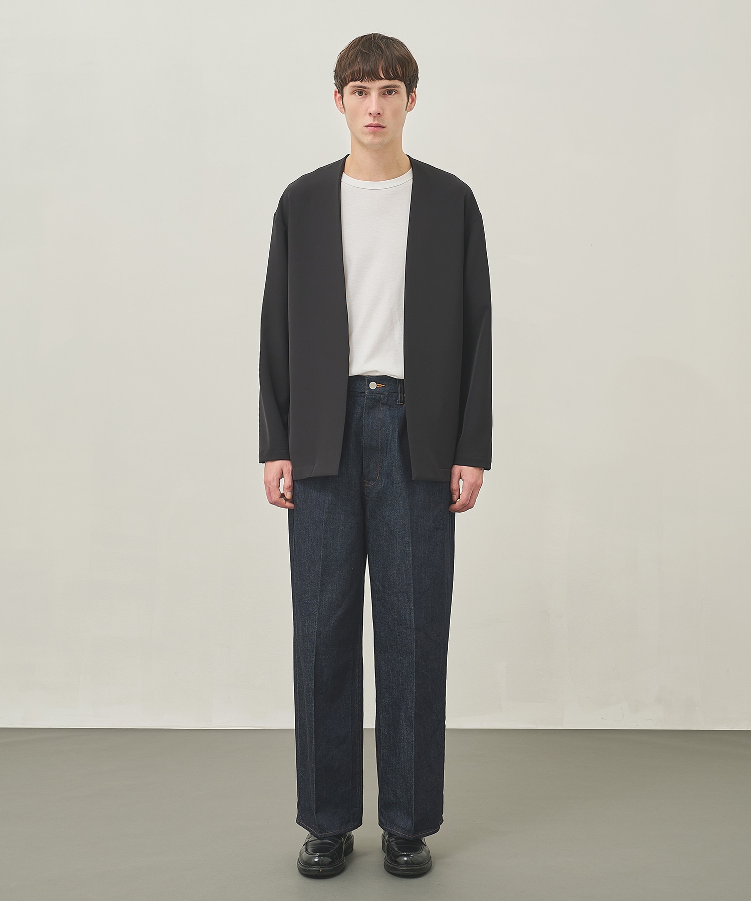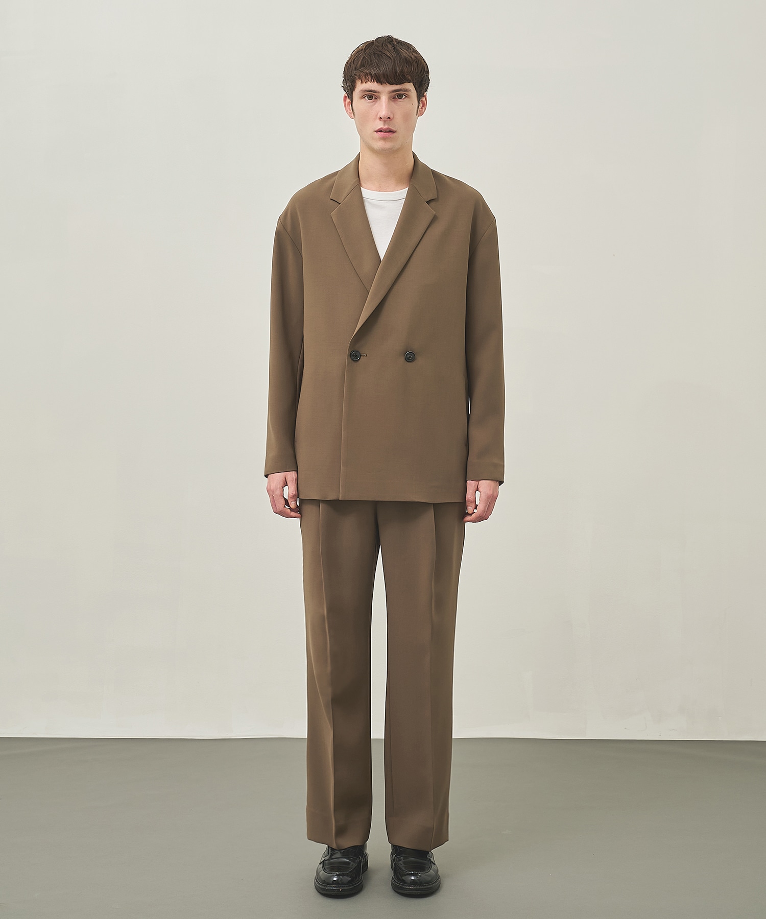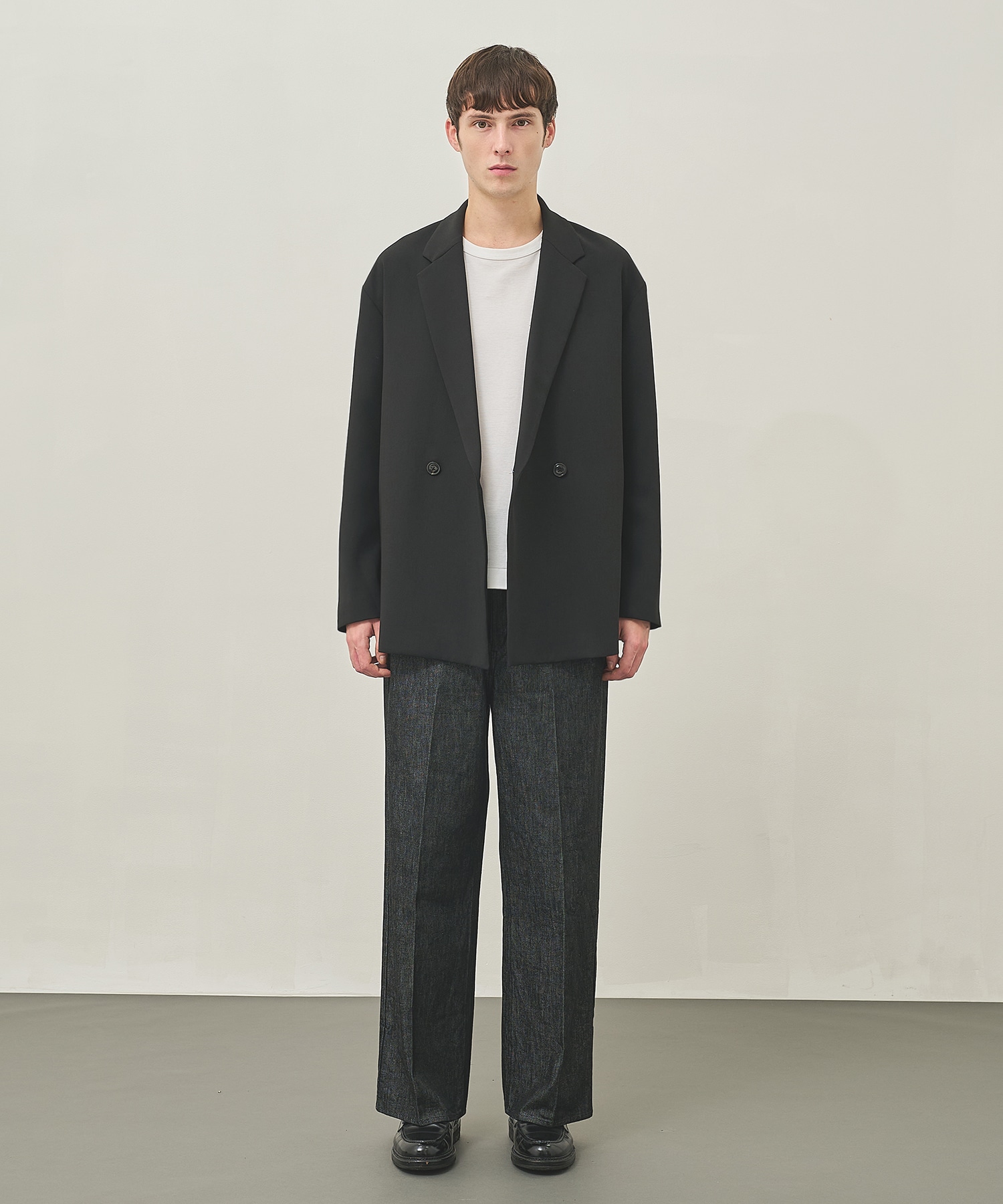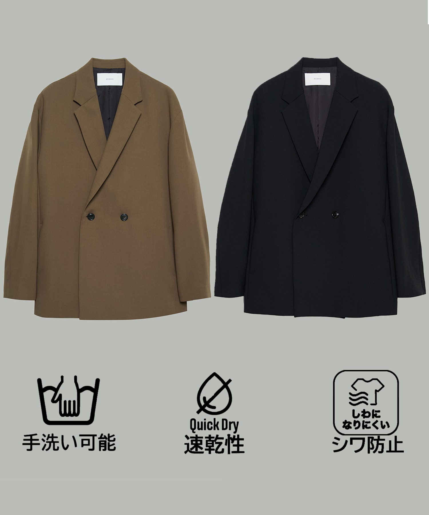 糸を密に編み込み、ポリエステルなのにウールのような光沢とハリのあるジャケット。ダブル仕様のジャケットなのに家庭で洗えて、速乾のイージーケアも持ち合わせた、オンオフ兼用のアイテム。