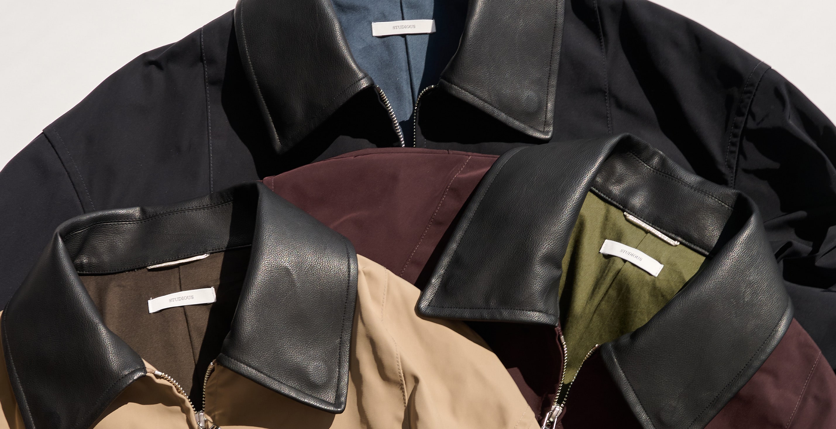 シボ感が格好良い経年変化するフェイクレザーの衿に、絶妙な光沢感と形状記憶性能が高いボディのコンビネーション。